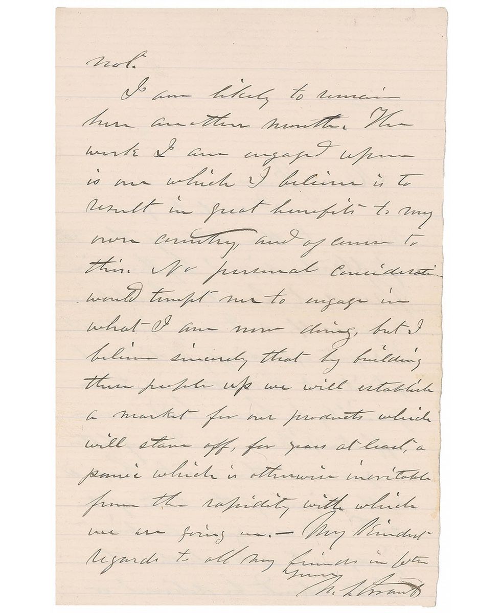 ALS, one page, lightly-lined both sides, 4.25 x 7, no date [circa Mexico 1881]. Letter written while serving as president of Gould’s Southern Railroad. Letter to “Jones.” In part: “I write to you in answer to the letter of the 30th of March, signed by the Vice President, Senator Conkling & yourself, and only just rec'd. I resent exceedingly I did not get it at Galveston in time possibly to have had some effect. Please read my letter to you, and the one to Garfield to the signers of the letter of the 30th and use your combined judgment as to whether the latter should be declined or not. I am likely to remain here another month. The work I am engaged upon is one which I believe is to result in great benefits to my own country, and of course to this. No personal consideration would tempt me to engage in what I am now doing but I believe sincerely that by building these people up we will establish a market for our products which will stave off, for years at least, a panic which is otherwise inevitable from the rapidity with which we are going on. My kindest regards to all my friends in W[ashington].” In fine condition, with a central horizontal fold and a bit of scattered light soiling.