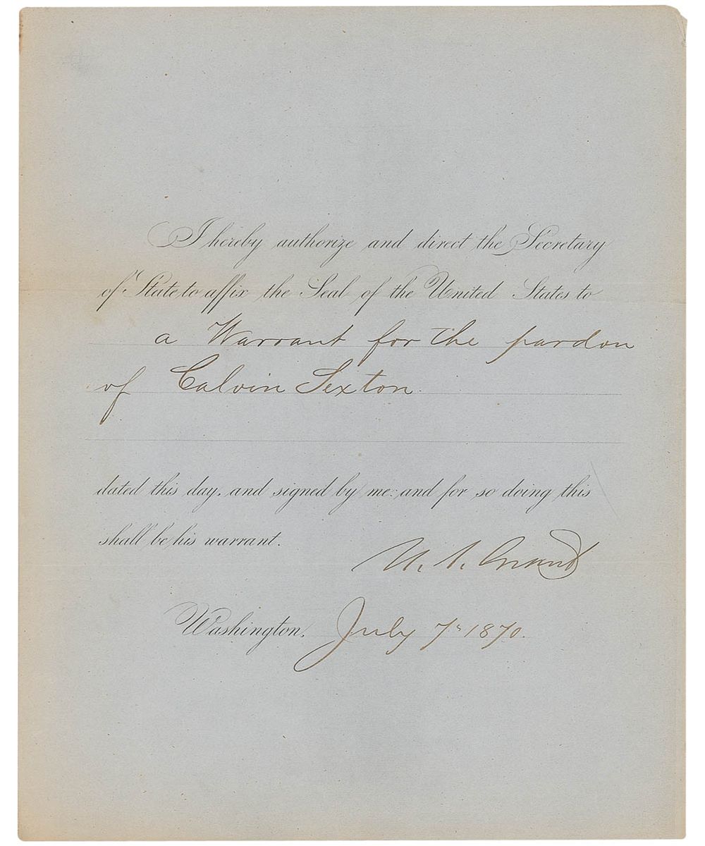 Partly-printed DS as president, one page, 8 x 10, July 7, 1870. Grant orders the secretary of state “to affix the Seal of the United States to a Warrant for the pardon of Calvin Sexton.” Two horizontal folds, one passing through the center of the signature, light scattered creases, and toning to the borders, otherwise fine condition.