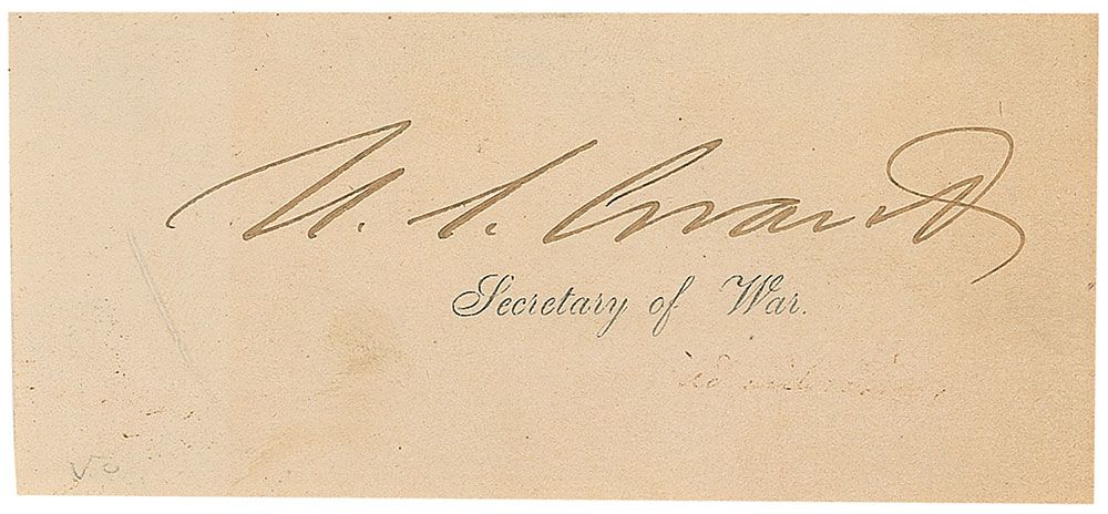 Ink signature, “U. S. Grant,” on an off-white 4 x 2 slip clipped from a larger document. In fine condition, with scattered light toning and slight ink remnants near bottom.