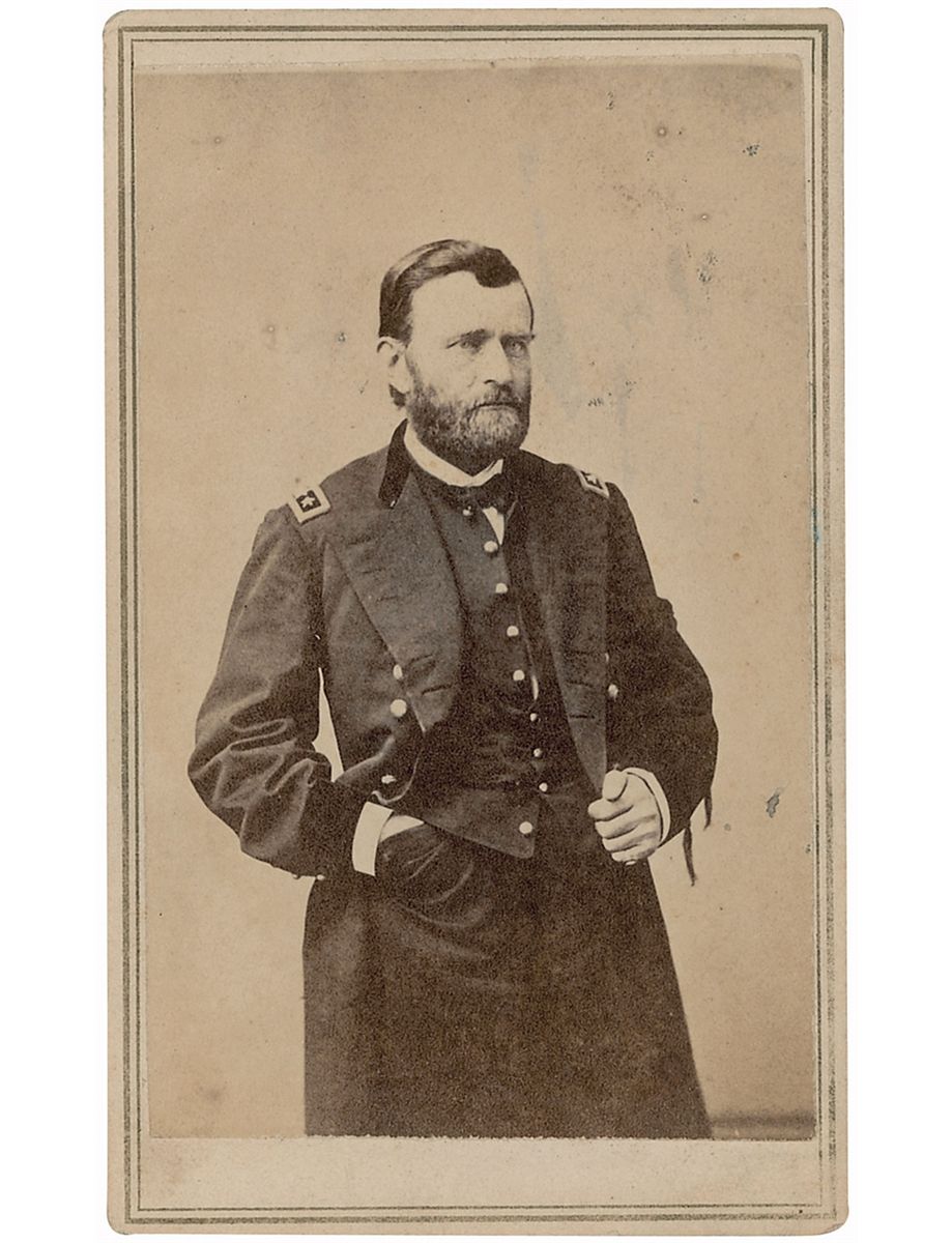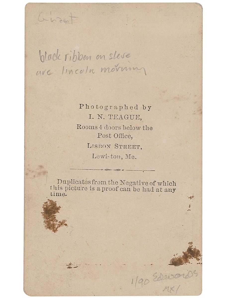 Original 1860s albumen carte-de-visite portrait of Grant in uniform and wearing a mourning crepe after Lincoln’s assassination, 2.5 x 4, by I. N. Teague of Lewiston, Maine. A sharp image, with general wear and toning and pencil note to reverse.