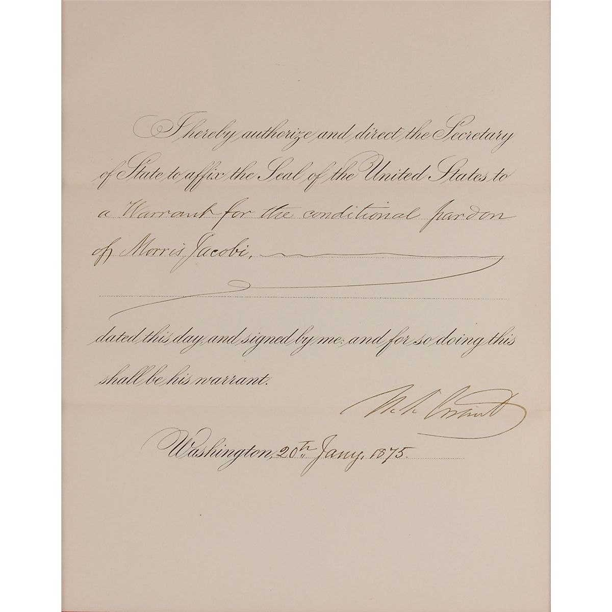 Partly-printed DS as president, one page, 7.25 x 9.25, January 20, 1875. Grant orders the secretary of state to “affix the Seal of the United States to a Warrant for the pardon of Morris Jacobi.” Signed at the conclusion by Grant. Double-matted and framed with a portrait of Grant to an overall size of 19.5 x 16. In fine condition, with a horizontal fold passing through the signature.