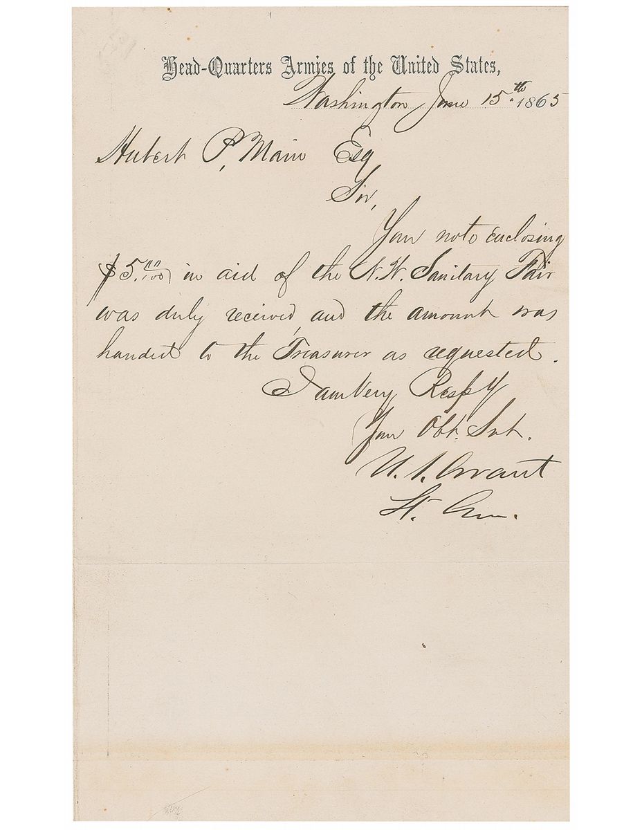 LS signed “U. S. Grant, Lt. Gen.,” one page, 4.75 x 8, Head-Quarters Armies of the United States letterhead, June 15, 1865. Letter to Hubert P. Main. In part: “Your note enclosing $5.00 in aid of the N. W. Sanitary Fair was duly received.” In fine condition, with thin mounting remnants to the left edge and a block of toning to the lower border (far from any writing).