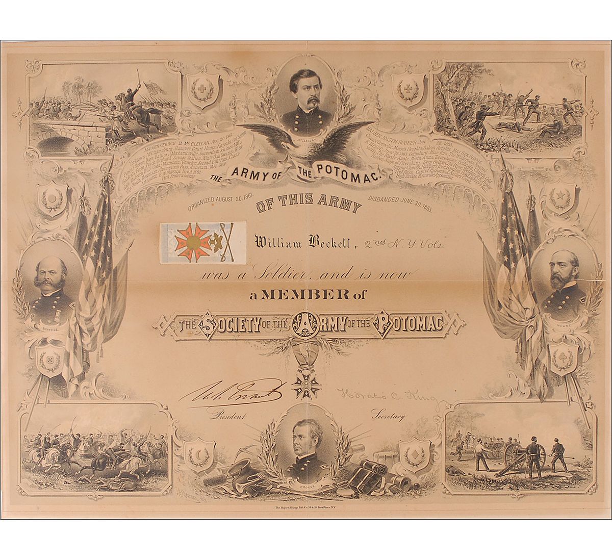 Signed by Grant as society president, and secretary Horatio King, this certificate confirmed at one such meeting, Beckett, a soldier of the 2nd N.Y. Volunteers, as a member of "Society of the Army of the Potomac," a fraternal organization for veterans of the Army of the Potomac. Pictured in the document are generals Burnside, McClellan, Meade and Hooker, all former presidents of the society.