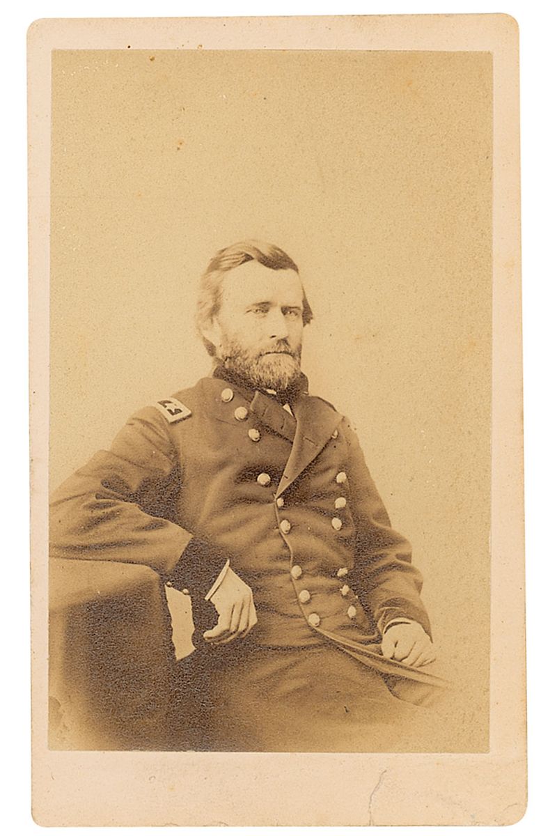 Original 2.25 x 4 carte-de-visite portrait of a relaxed Grant in uniform. Published by Brady’s National Photographic Portrait Galleries of Washington. A small tear and crease to the lower border (neither affecting the image), otherwise fine condition.