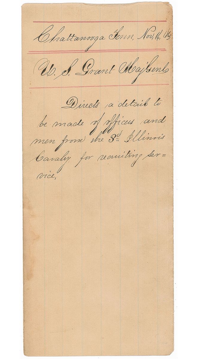 Unsigned war-dated docketing panel for a letter, 3.25 x 8 folded, dated November 14, 1863. Filled out in an unknown hand panel reads, “Chattanooga, Tenn,…U. S. Grant, Maj. Genl. Directs a detail to be made of officers and men from the 3d Illinois Cavalry for recruiting service.” In fine condition, with some scattered light toning. The letter is not included.