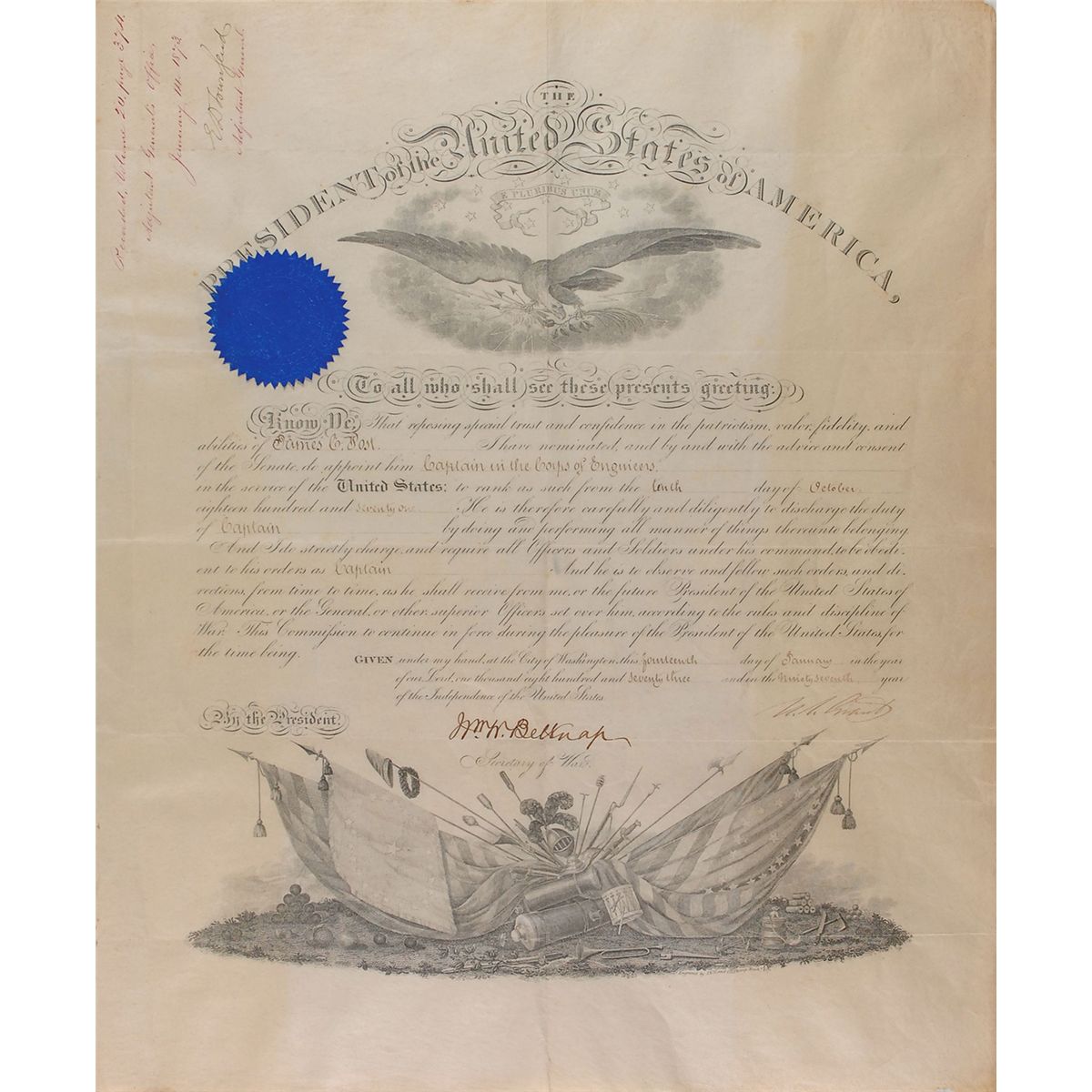 Partly-printed DS as president, one page, 15.75 x 19.5, January 14, 1873. President Grant appoints James C. Post “Captain in the Corps of Engineers in the service of the United States.” Signed at the conclusion by Grant and countersigned by Secretary of War William W. Belknap. Intersecting folds and some scattered light toning and wrinkling, otherwise fine condition. The blue seal is worn, but intact.