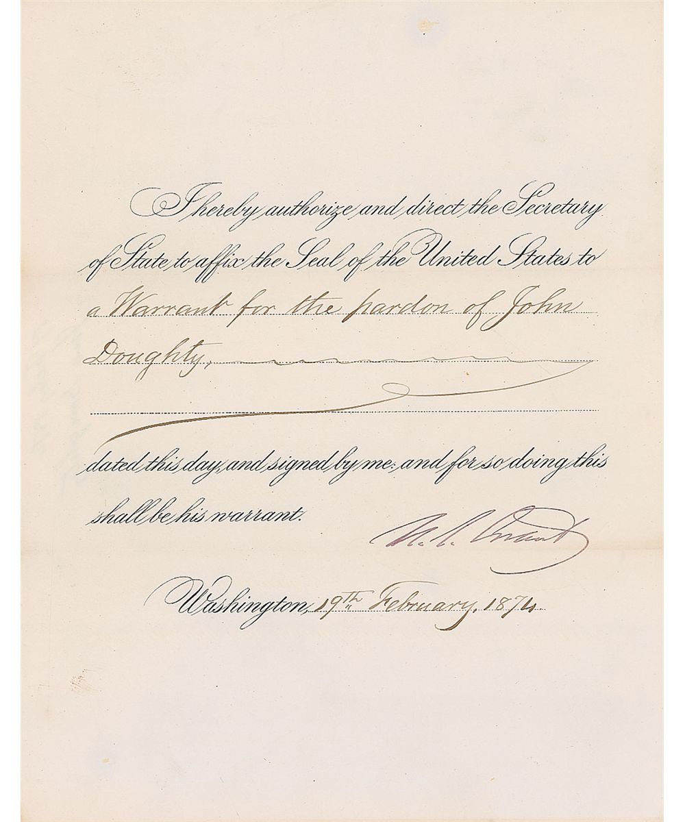 Partly-printed DS as president, one page, 7.75 x 9.75, February 19, 1874. President Grant directs the Secretary of State to “affix the Seal of the United States to a Warrant for the pardon of John Doughty.” In fine to very fine condition.