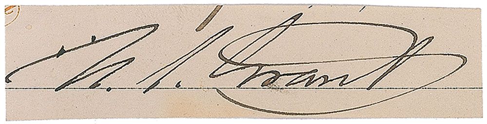 Ink signature, “U. S. Grant,” on an off-white 2.5 x .5 lightly-lined slip. In fine condition. Accompanied by a color copy of the envelope which once held the signature, notated in an unknown hand, “For Julia & her children, General U S Grant’s autograph, some later 1885 during last illness. Written in 1878.”