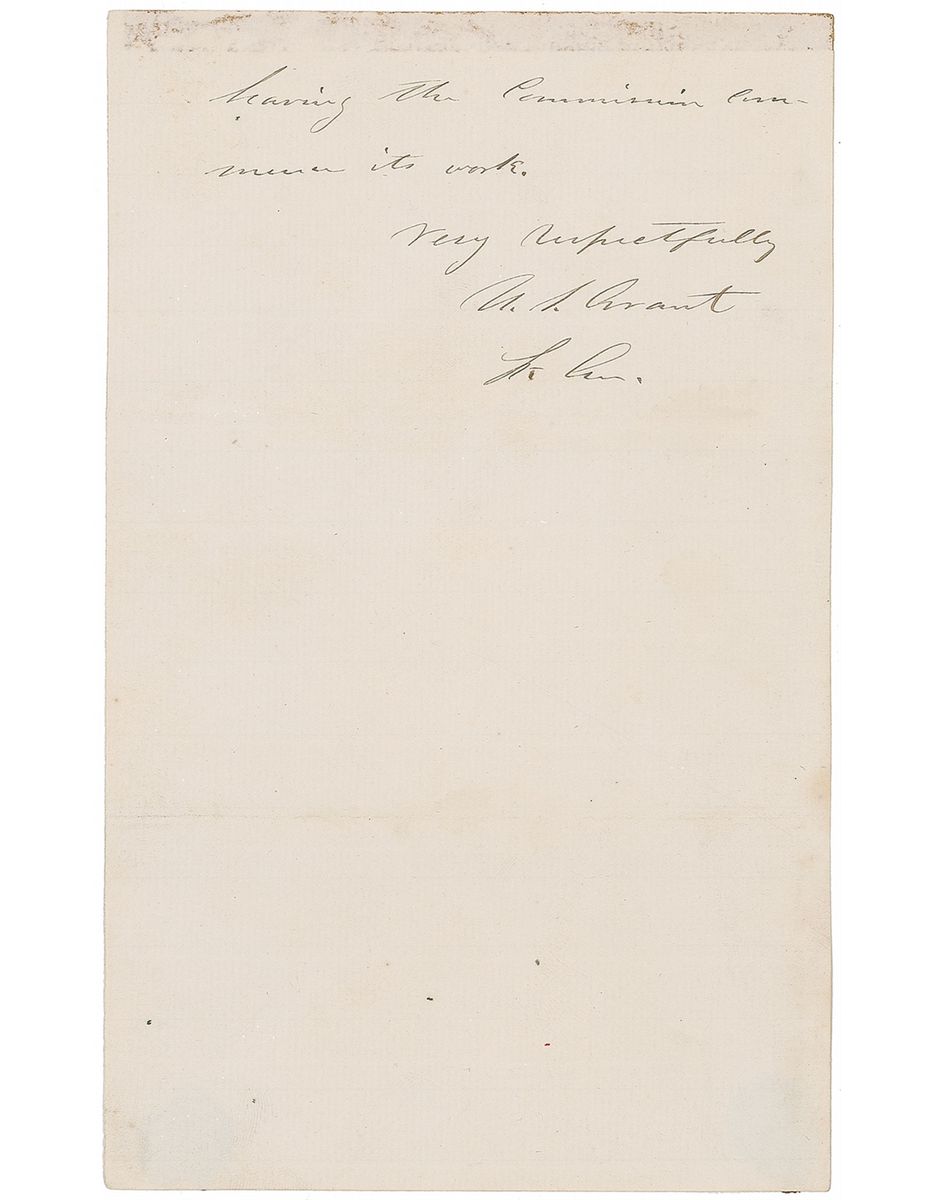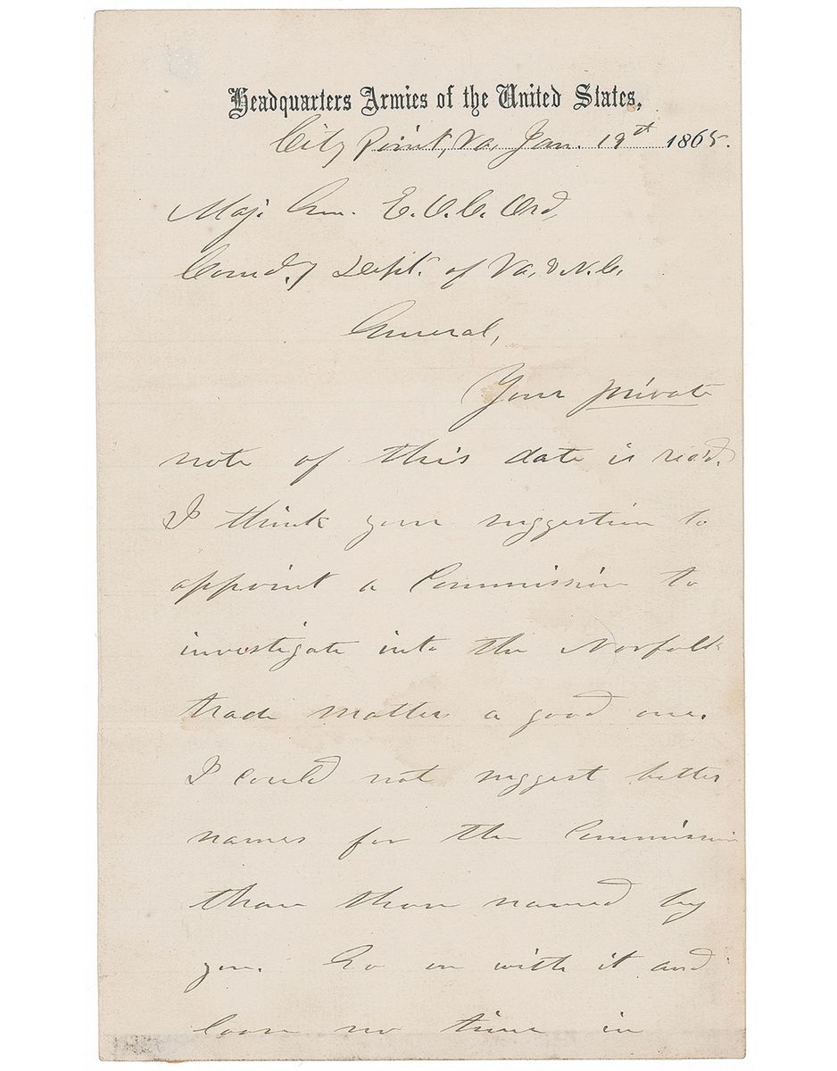 Civil War–dated ALS signed “U. S. Grant, Lt. Gen.,” two pages, 5 x 8, Headquarters Armies of the United States letterhead, January 19, 1865. Letter to Major General Edward O. C. Ord, written from City Point, Virginia. In full: “Your private note of this date is rec'd. I think your suggestion to appoint a Commission to investigate into the Norfolk trade matter a good one. I could not suggest better names for the Commission than those named by you. Go on with it and lose no time in having the Commission commence its work.” In fine condition, with a bit of scattered mild dampstaining and mounting remnants to reverse edges lightly showing through.