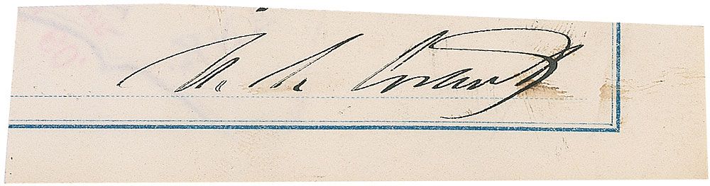 Ink signature, “U. S. Grant,” on an off-white 3.25 x .75 clipped slip. In fine condition, with a slight brush to the end of the signature.