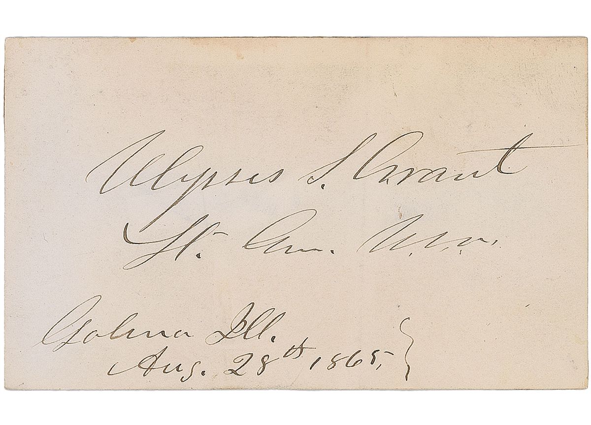 Ink signature, “Ulysses S. Grant, Lt. Gen. U.S.A., Galena, Ill., Aug. 28th, 1865,” on an off-white 4 x 2.5 card. In fine condition, with light scattered toning and soiling. Grant had returned to Galena, his hometown, on August 18, welcomed by a jubilant populous excited to see its new war hero. There were parades, fireworks, and speeches given, and Grant was presented with a house, which he lived in until becoming president. Full Grant signatures from any period of his life are extraordinarily rare and almost never appear at auction.
