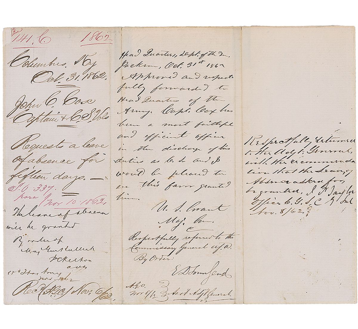 Civil War–dated handwritten endorsement, signed “U. S. Grant, Maj. Gen.,” on the reverse of a one-page letter to Grant by Captain John C. Cox, 7.75 x 9.75, October 31, 1862, requesting a 15-day leave of absence. Grant approves the request, writing: “Approved and respectfully forwarded to Head Quarters of the Army. Capt. Cox has been a most faithful and efficient officer in the discharge of his duties as C. S. [Commissary] and I would be pleased to see this favor granted him.” Several days later, the request was approved by Major General Halleck (endorsed by one of his adjutants) and then by Assistant Adjutant General E. D. Townsend on November 8, 1862. Small repaired separations at edges of mailing folds, otherwise fine condition. Captain Cox enlisted in the Commissary Department on August 5, 1861, and resigned in June 1864, rising to a rank of brevet brigadier general. Cox was stationed in Columbus, Kentucky, which bordered Missouri and one year earlier had been the site of General Grant’s first direct combat engagement of the war at the Battle of Belmont. An interesting and highly desirable piece from an early date in the war.