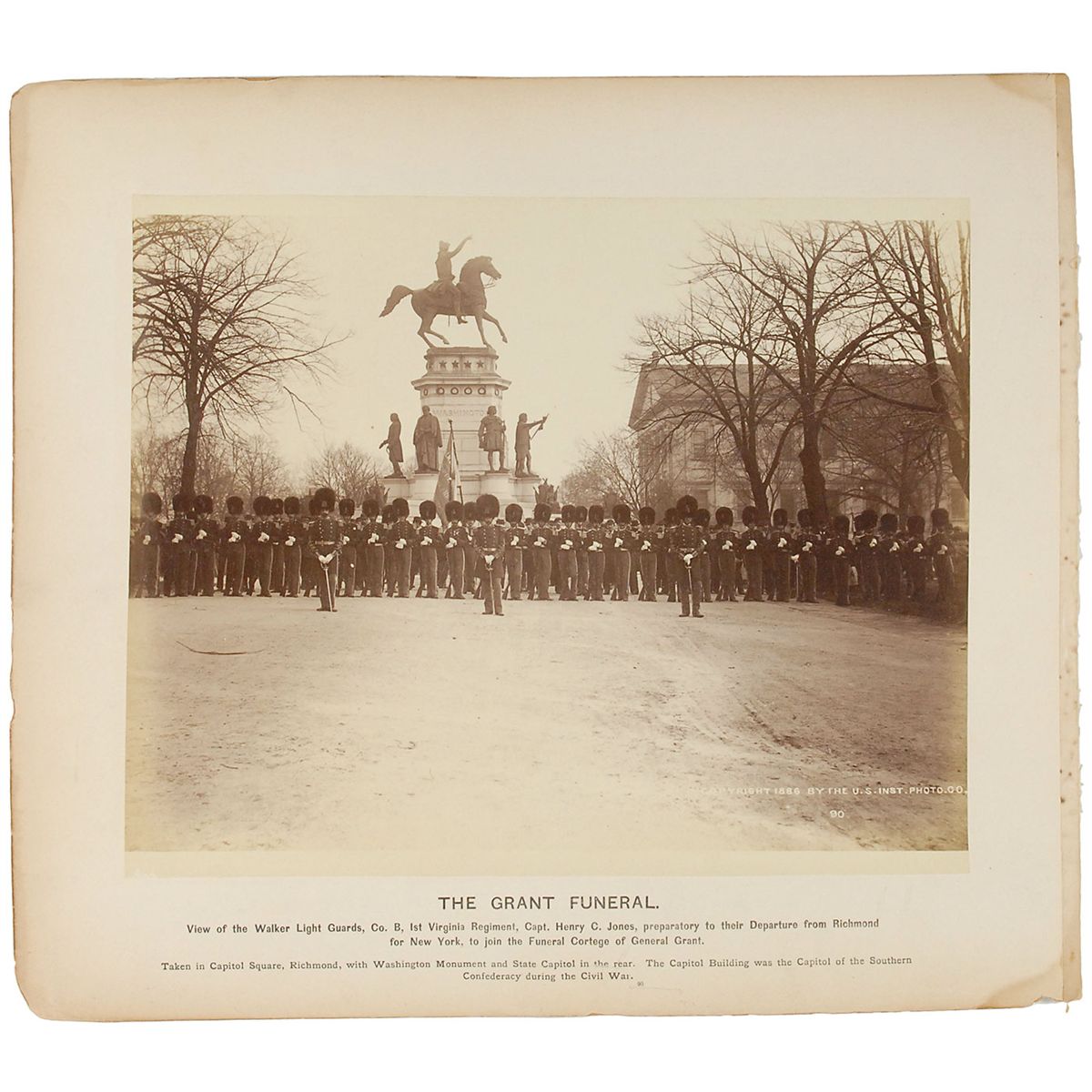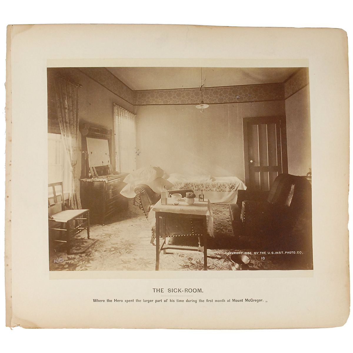 Two oversized 11.5 x 9.75 photos affixed to opposing sides of a single 15 x 13 mount: one of President Grant’s sickbed, captions: “The Sick-Room. Where the Hero spent the larger part of his time during the first month at Mount McGregor”; and the other showing the Walker Light Guards before Grant’s funeral, captioned: “The Grant Funeral. View of the Walker Light Guards, Co. B, 1st Regiment, Capt. Henry C. Jones, preparatory to their Departure from Richmond for New York, to join the Funeral Cortege of General Grant.” Some staining and chipping to mount edges, and a mounting strip along one edge, otherwise fine condition.