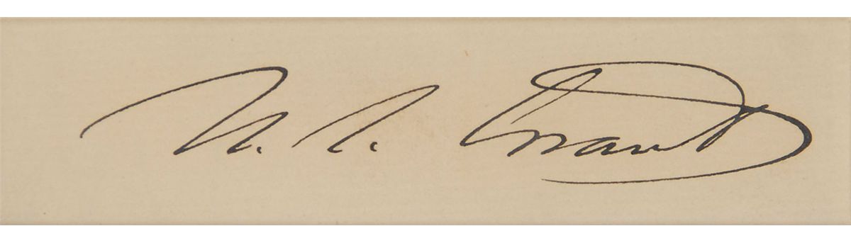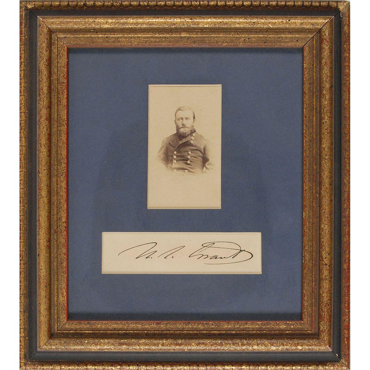 Ink signature, “U. S. Grant,” on an off-white slip. Matted and framed with an E. & H. T. Anthony carte-de-visite portrait of Grant in uniform to an overall size of 9.25 x 10.5. In fine condition.