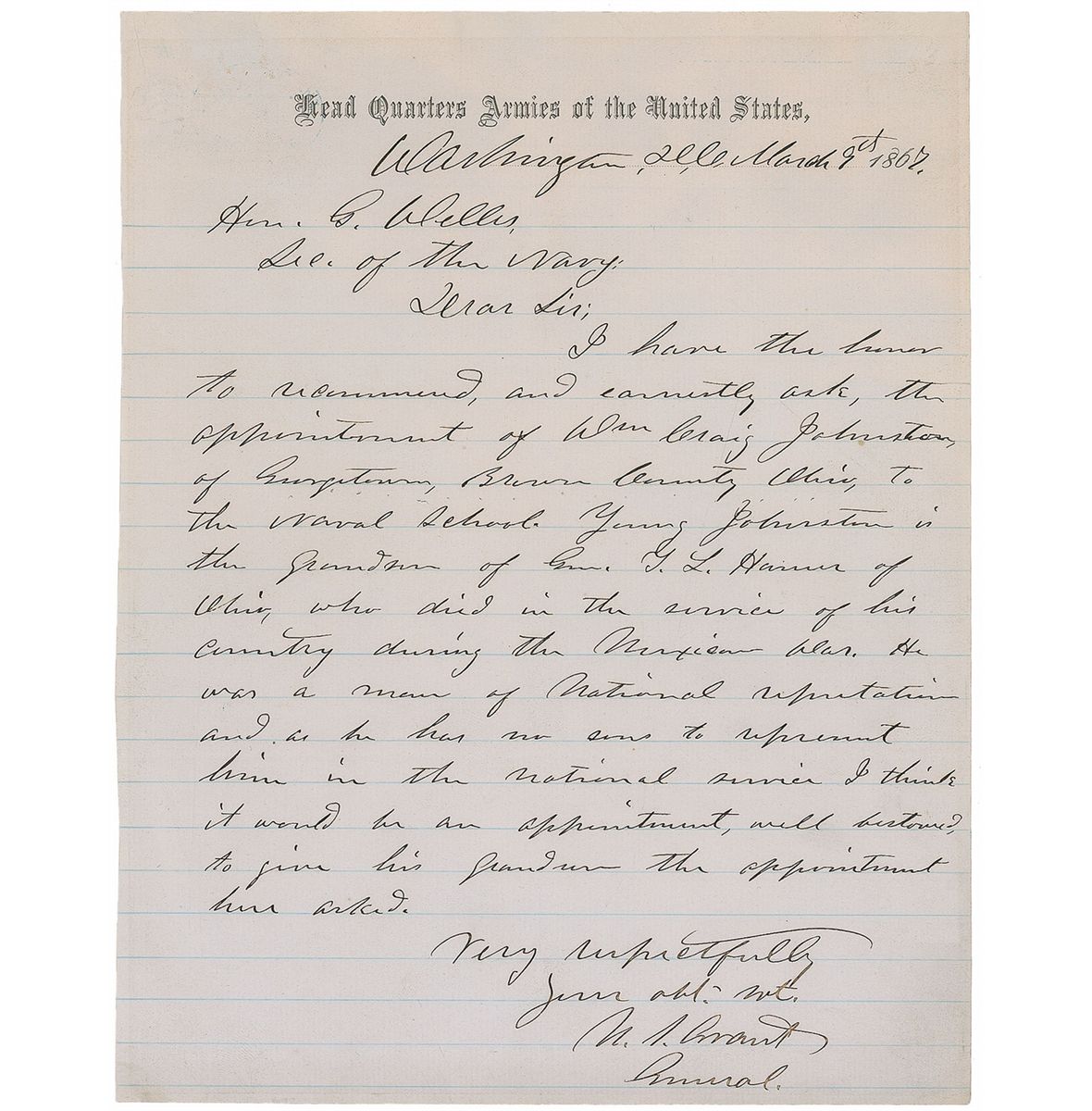 ALS signed “U. S. Grant, General,” one page, lightly-lined, 7.5 x 9.75, Head Quarters Armies of the United States letterhead, March 9, 1867. Letter to Secretary of the Navy Gideon Welles. In part: “I have the honor to recommend, and earnestly ask, the appointment of Wm Craig Johnston…to the naval school. Young Johnston is the grandson of Gen. T. L. Hamer of Ohio, who died in the service of his country during the Mexican War.” In fine condition, with intersecting folds and a slightly trimmed left edge. A fascinating letter due to an important association between Grant and Hamer. The late general, Thomas L. Hamer, was a congressmen as well as a soldier, representing Grant’s home state of Ohio. While serving in the House of Representatives, he nominated Grant to be a cadet at West Point—however, he incorrectly wrote his name as ‘Ulysses S. Grant,’ rather than the aspiring soldier’s given name, Hiram Ulysses Grant. The mistaken moniker stuck, and Grant used the name for the rest of his life.