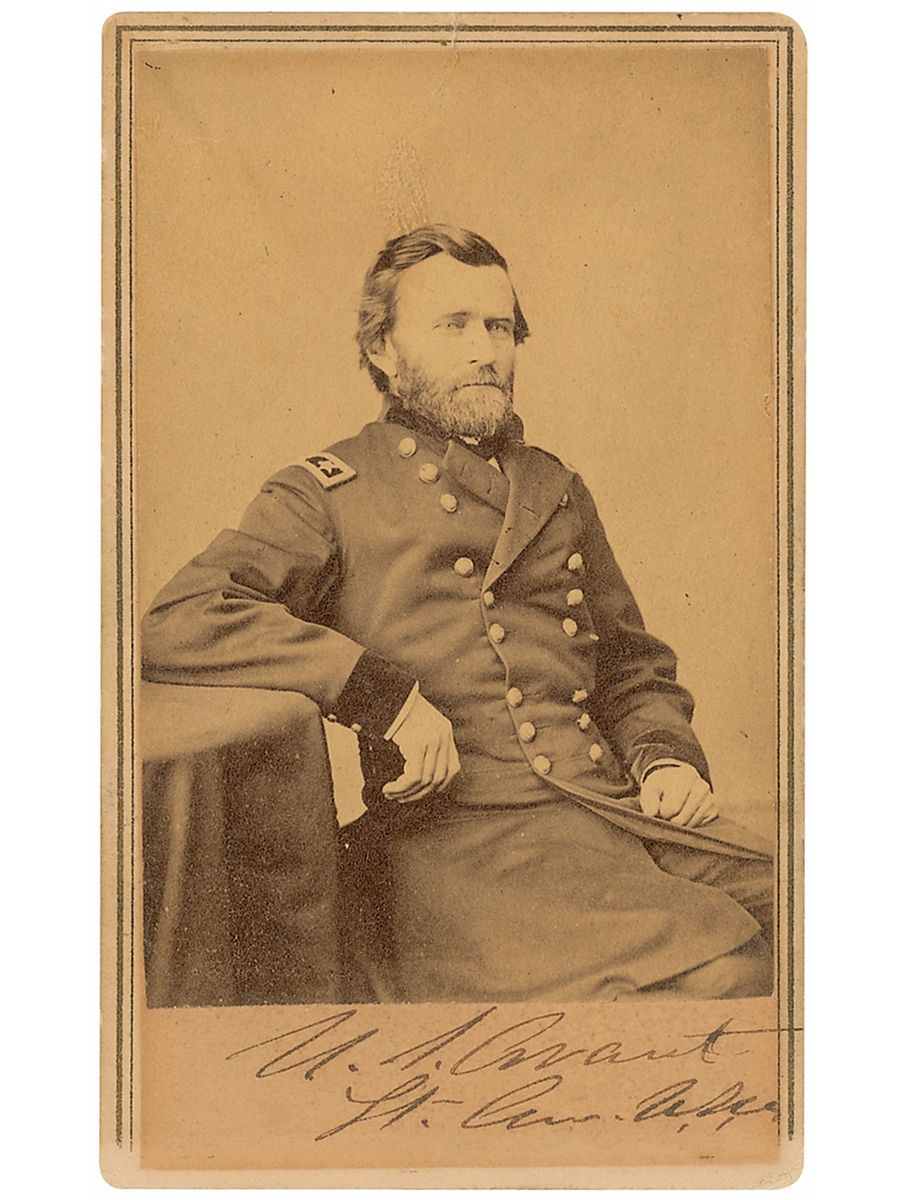 Scarce Civil War–dated original 2.25 x 4 carte-de-visite portrait of Grant in uniform, resting his arm on a table, signed in the lower border in black ink, “U. S. Grant, Lt. Gen. U. S. A.” Published by E. & H. T. Anthony of New York, from a Brady negative. Ink notation to reverse reads, “Given by Gen. to J. J. Williams at City Point, Va., Oct. 1864.” A small tear to the top (not affecting the crisp and clean overall appearance), otherwise fine condition. In October 1864, the Union was engaged in the lengthy Siege of Petersburg, and Grant’s headquarters were at City Point. A sharp image and magnificent example on its own, made even more desirable with its superb wartime association.