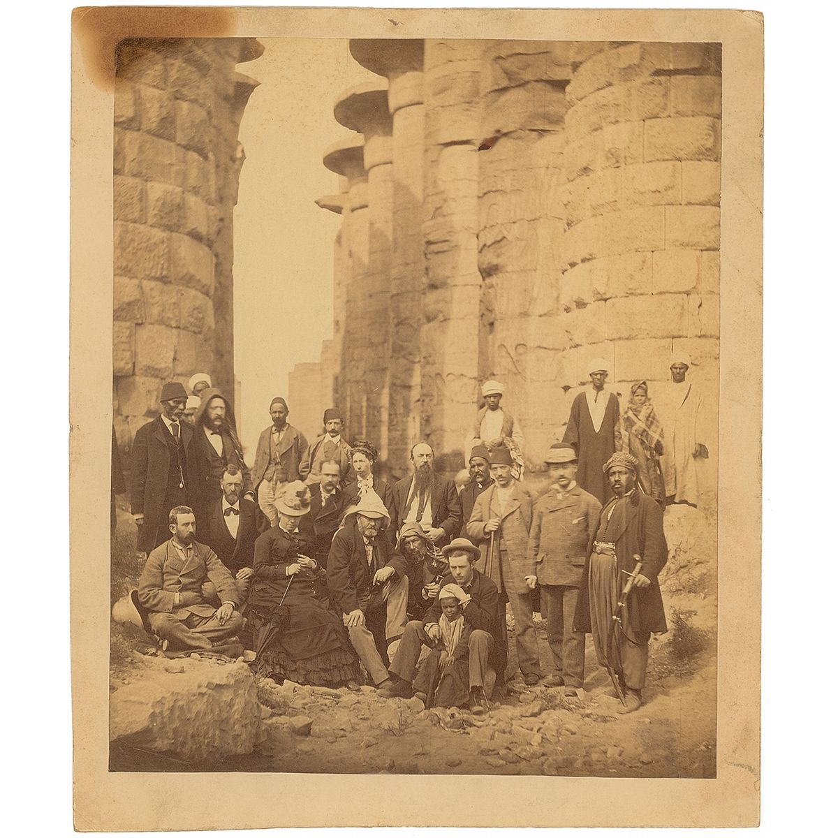 Original and large unsigned albumen photo, 9.5 x 11.5, affixed to a 10.75 x 13 mount, of U. S. Grant, his wife Julia, and his two sons Frederick and Jesse, posing alongside their guides and porters at the Karnak Temple Complex near the ancient city of Thebes, taken circa late January 1878. In fine condition, with a few light dings and corner tip bends to image, an area of toning to top left affecting just the corner tip of the image, and some dings and soiling to mount. In the March 4, 1878, issue of the New York Herald, John Russell Young, a correspondent who accompanied Grant during his tour wrote, in part: ‘We gathered under the shade of a column, and, having carpeted a broken column for Mrs. Grant, sat around her and refreshed ourselves out of a basket…The General wears his pith helmet, swathed in silk, and you just catch a glimpse of the eyes and all the force of his brave, kind, strong face. Mrs. Grant sits near him, shrinking from the sun.’ Grant’s world tour began shortly after leaving the White House and spanned over two-and-a-half years, with stops in England, Germany, China, Hong Kong, India, Italy, and Egypt.
