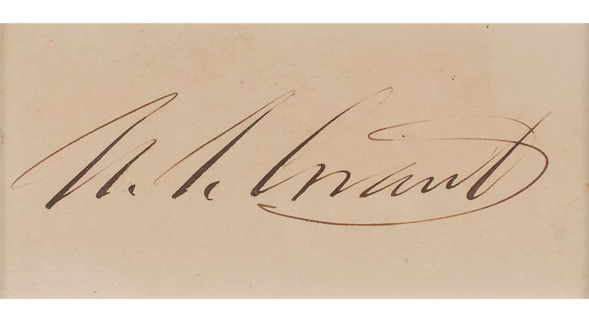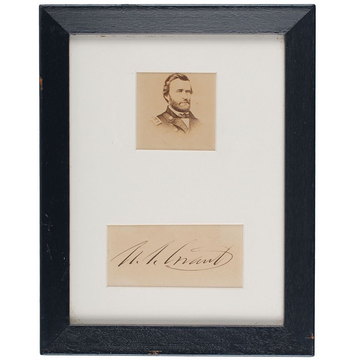 Large and bold ink signature, “U. S. Grant,” on an off-white 3.5 x 1.5 slip. Matted and framed with a portrait of Grant to an overall size of 7 x 9. In fine condition, with uniform toning and trivial dampstaining to the right edge.