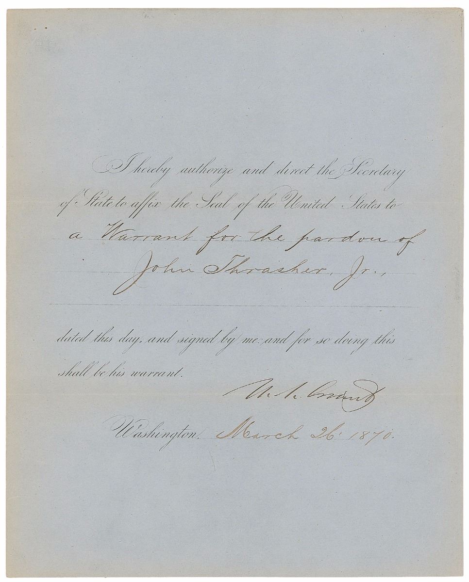 Partly-printed DS as president, one page, 8 x 10, March 26, 1870. President Grant directs the “Secretary of State to affix the Seal of the United States to a Warrant for the pardon of John Thrasher, Jr.” Signed at the conclusion by President Grant. In fine condition, with the lower horizontal fold passing through the signature and toning to edges.