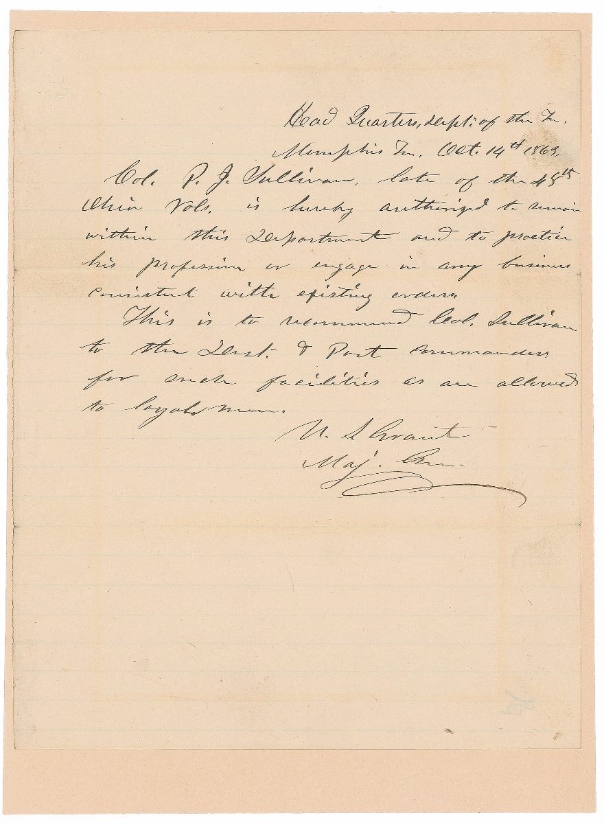 Civil War–dated ALS signed “U. S. Grant, Maj. Gen.,” one page, lightly-lined, 7.75 x 9.75, October 14, 1863. Letter concerning a colonel wounded at the Battle of Shiloh. In full: “Col. P. J. Sullivan, late of the 48th Ohio Vols. is hereby authorized to remain within this Department and to practice his profession or engage in any business consistent with existing orders. This is to recommend Col. Sullivan to the Dist. & Port commanders for such facilities as are allowed to loyal men.” Affixed at the left edge to a slightly larger cardstock sheet. In fine condition, with intersecting folds and light toning and soiling.