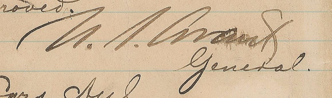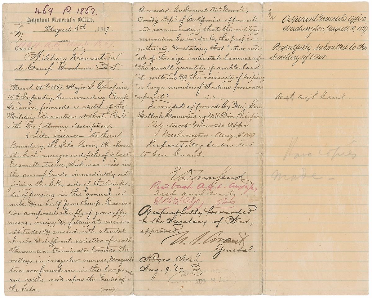 Endorsement signature, “U. S. Grant,” at the conclusion of manuscript DS signed “E. D. Townsend,” one page, 10 x 8, August 6, 1867. Grant signs on August 9 to approve the document and forward it to the secretary of war. In part: “Case of Military Reservation at Camp Goodwin, AT [Arizona Territory]…Major G. Chapin, 14th Infantry, Commanding Camp Goodwin, forwards a sketch of the Military Reservation at that Post with the following description: 6 miles square—Northern Boundary of the Gila River, the channel of which averages a depth of 2 feet. A small stream, Tuloiosa rises in the swamp lands immediately adjoining the S.E. side of the Camp…Reservation composed chiefly of gravelly mesas, rising and falling at various altitudes and covered with stunted shrubs and different varieties of cacti…Forwarded by General McDowell…approved and recommending that the military reservation be made by the proper authority, and stating that ‘it is needed of the size indicated because of the small quantity of arable land it contains and the necessity of keeping a large number of Indian prisoners upon it.’” In very good condition, with a vertical fold passing through a single letter of Grant’s signature, repaired separations to the two main vertical storage folds, and scattered toning. Camp Goodwin was originally used as an Army base during the Apache War and for protecting settlers in the Upper Gila River region. It was abandoned in 1871 due to frequent outbreaks of malaria, but subsequently used as a subagency of the San Carlos Apache Indian Reservation until about 1884. One of Grant’s chief policies in his campaign platform the year after this document was an ‘Indian Peace Policy’ to establish reservations and reduce frontier violence.
