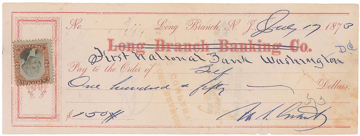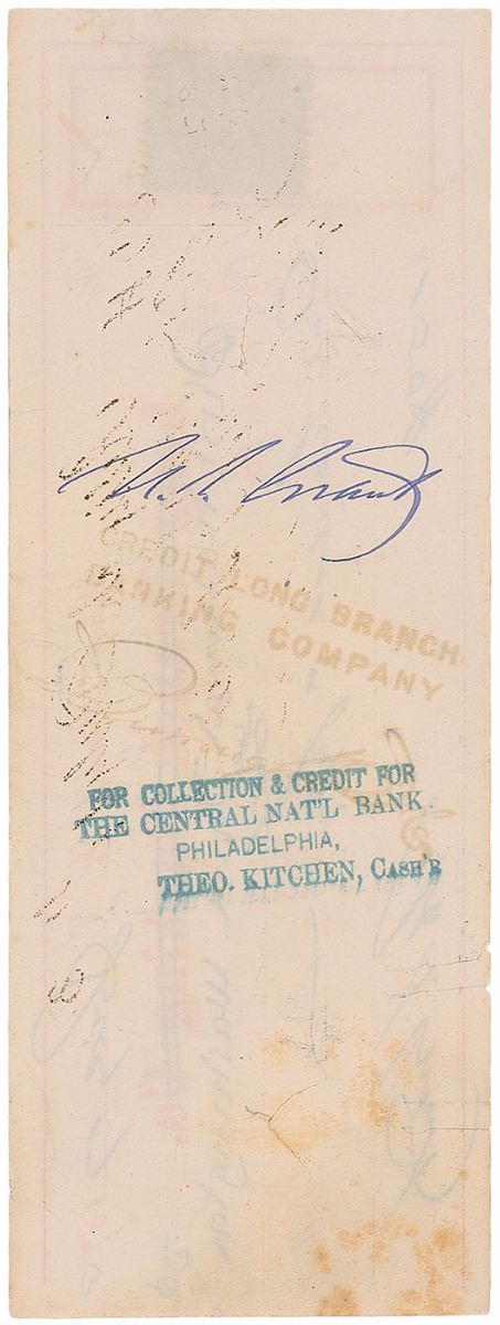 Desirable bank check as president, 8 x 3, filled out and signed by Grant, “U. S. Grant,” payable to “Self” for $150, July 17, 1873, also endorsed on the reverse by Grant. All but the name of the bank is in Grant’s hand. Expected check wear, cancellation slits to the bottom edge extending into Grant’s signature, a bit of brushing to the first letter, light foxing to the right side, and some mild ink transfer to the reverse, otherwise fine condition.