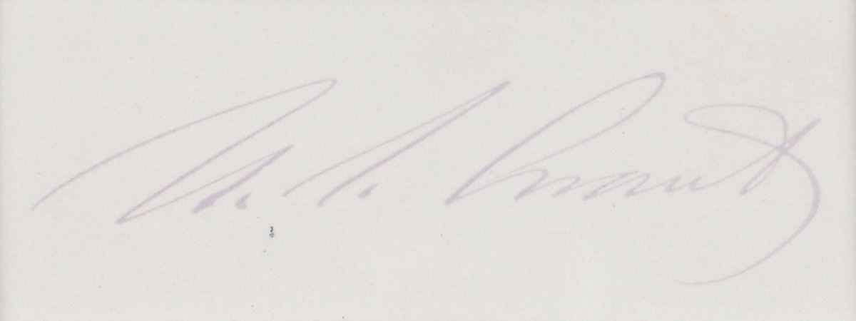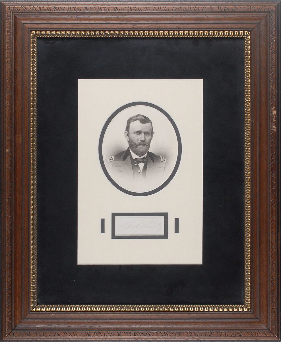 Ink signature, “U. S. Grant,” on an off-white 3 x 1.25 card. Nicely double-matted and framed with an engraved portrait of Grant in military uniform to an overall size of 18.25 x 22.25. In fine condition.
