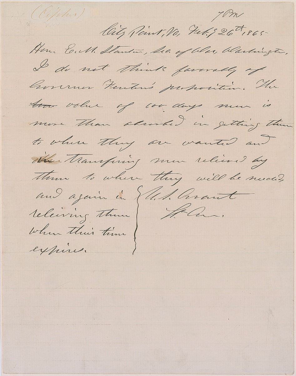 Civil War–dated ALS signed “U. S. Grant, Lt. Gen.,” one page, 7.75 x 9.75, February 26, 1865. Letter to Secretary of War Edwin M. Stanton, written from Grant’s headquarters at City Point. In full: “I do not think favorably of Governor Fenton’s proposition. The value of 100 days men is more than absorbed in getting them to where they are wanted and in transferring men relieved by them to where they will be needed, and again in relieving them when their time expires.” Professionally inlaid into a slightly larger sheet. In fine condition, with brushing to ink in a single word. Reuben Fenton, governor of New York, had asked Stanton if he would accept ‘five or ten regiments of State National Guard for 100 days to do garrison duty in Charleston, Savannah, Wilmington or other posts.’ Grant, observing that the logistics of such an idea render it pointless, declines. At this time Union victory seemed inevitable, as Grant had Lee surrounded in Petersburg and the Union had most Southern cities well under their control as Sherman swept up the coast from Georgia. The war was indeed nearly over, with Lee’s surrender coming just forty-two days after General Grant penned this letter.