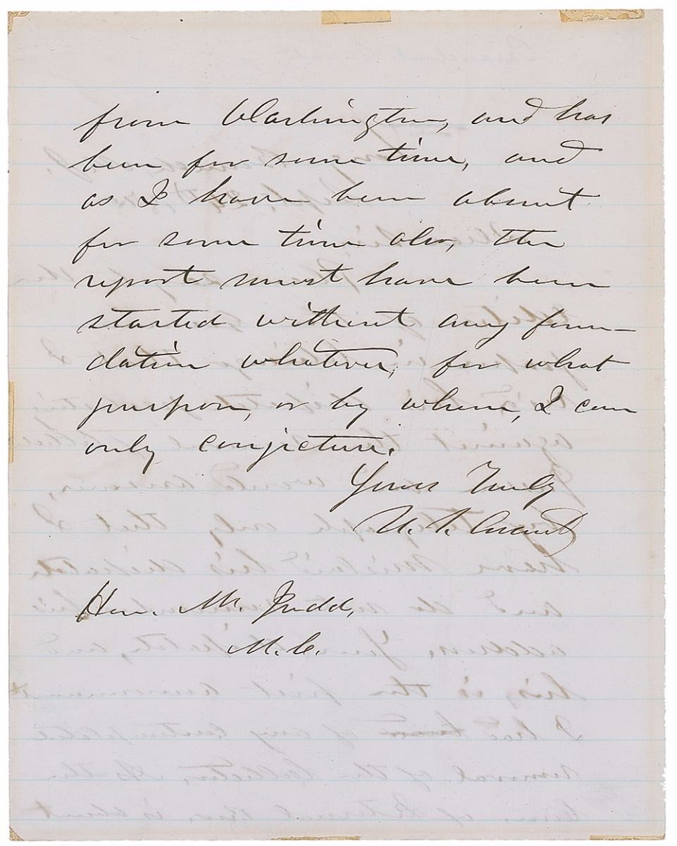 ALS as president, one page, lightly-lined both sides, 7.75 x 9.75, September 24, 1870. Letter sent from Long Branch, New Jersey, to Illinois Congressman Norman Judd. In full: “Please say to the editor of the German paper in Chicago that I rec'd his dispatch protesting against the removal of Collector Gusser and would answer by telegraph only that I have mislaid his dispatch and do not remember his address. Your dispatch, and his, is the first announcement I had of any contemplated removal of the Collector. As the Comm. of Internal Rev. is absent from Washington, and has been for some time, and as I have been absent for some time also, the report must have been started without any foundation whatever, for what purpose or by whom, I can only conjecture.” In fine condition, with tape remnants to top and bottom edges, and show-through from writing to opposing sides.
