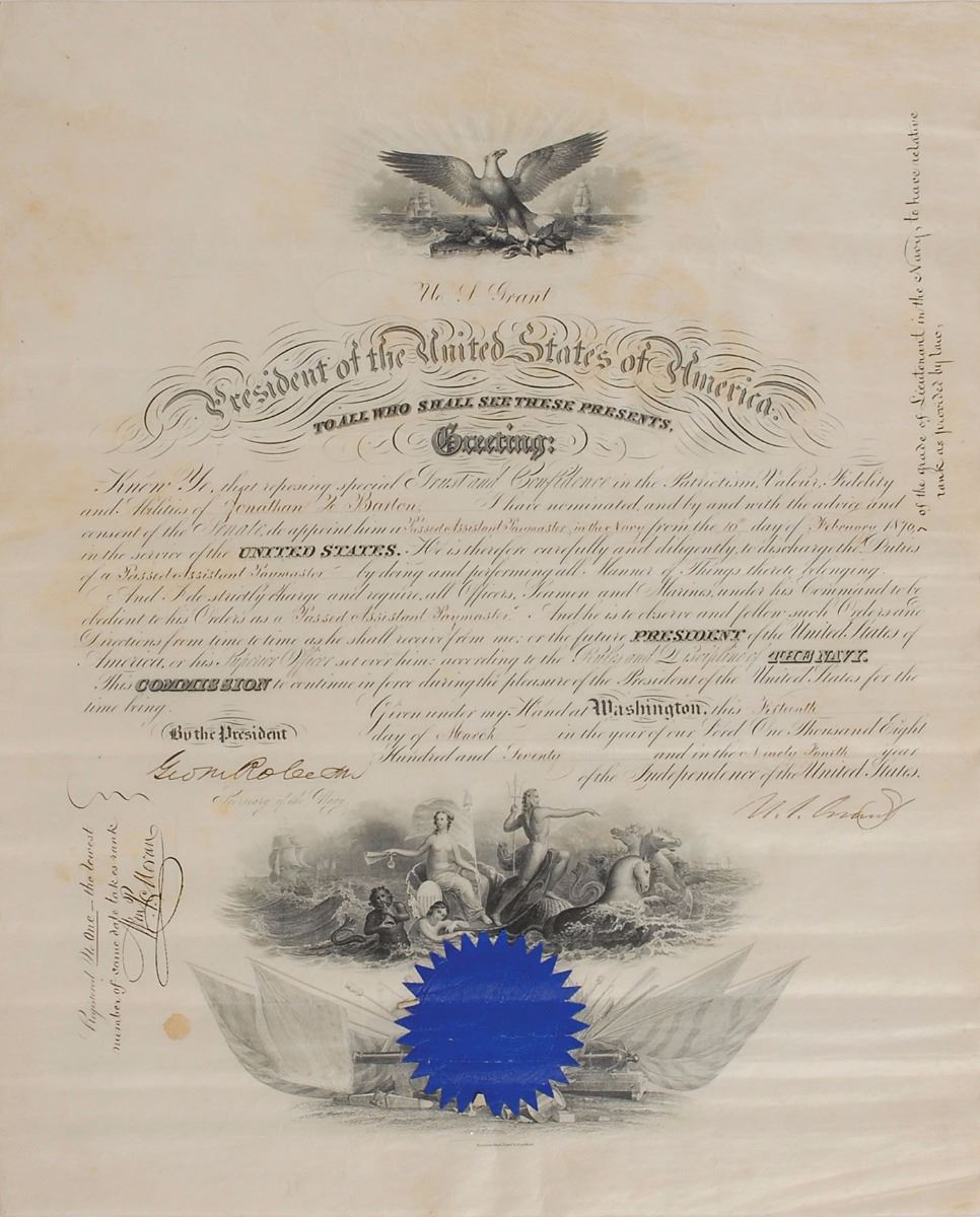 Partly-printed vellum DS as president, one page, 15.75 x 19.25, March 15, 1870. President Grant appoints Jonathan L. Barton as “Passed Assistant Paymaster in the Navy…in the service of the United States.” Signed at the conclusion by Grant, and countersigned by George M. Robeson as secretary of the Navy. Embossed blue seal affixed to lower center remains intact. In very good to fine condition, with moderate overall rippling, and areas of light staining and creasing. Accompanied by a full letter of authenticity from PSA/DNA.