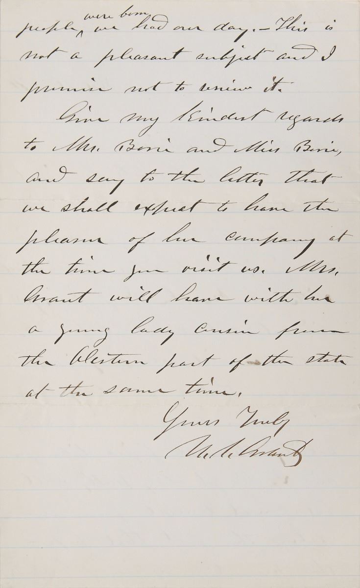 Amusing ALS as president, one page, lightly-lined both sides, 5.75 x 9.25, Executive Mansion letterhead, December 20, 1871. Letter to former Secretary of the Navy Adolph Borie, in full: “Mrs. Grant has just asked me whether I had included Miss. Borie, your niece, in the invitation to return to Washington with us on the 8th of January. I did not, but now write to ask that she will accompany you, with assurances that a young lady can find more to amuse in Washington society than old fogies like you and I. We get along pretty well but cannot conceal from our selves the fact that before the present generation of happy people were born we had our day. This is not a pleasant subject and I promise not to review it. Give my kindest regards to Mrs. Borie and Miss Borie, and say to the latter that we shall expect to have the pleasure of her company at the time you visit us. Mrs. Grant will have with her a young lady cousin from the Western part of the state at the same time.” In fine condition. It is interesting to see Grant reflect on his youth—writing, “before the present generation of happy people were born we had our day”—as he had a difficult upbringing and only in the war years did he come out from under the thumb of an odd, undermining father and flourish as both a man and a soldier. Letters alluding to this period of his life are quite rare.