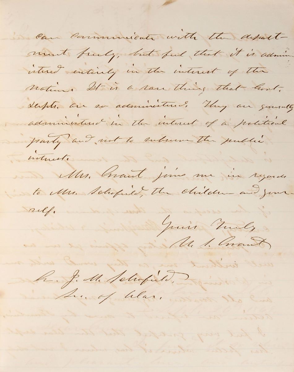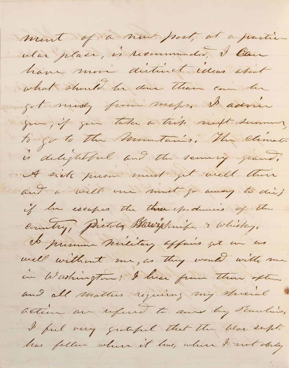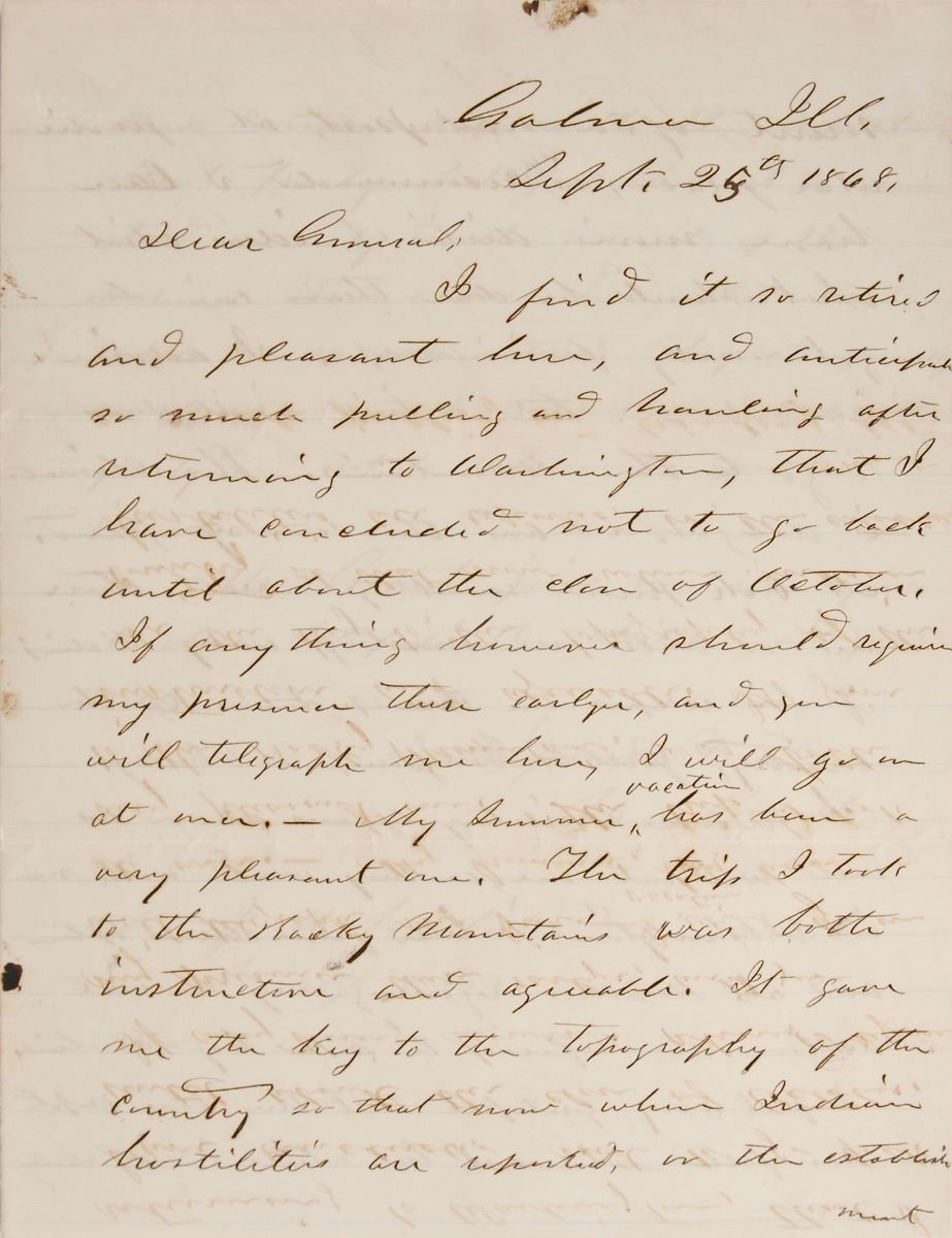 ALS, three pages on two adjoining sheets, 7.75 x 9.75, September 25, 1868. Letter to Secretary of War John M. Schofield, in part: “I find it so retired and pleasant here, and anticipated so much pulling and hauling after returning to Washington, that I have concluded not to go back until about the close of October. If anything however should require my presence there earlier, and you will telegraph me here I will go on at once.—My summer vacation has been a very pleasant one. The trip I took to the Rocky Mountains was both instructional and agreeable. It gave me the key to the topography of the country so that now Indian hostilities are reported, or the establishment of a new post, at a particular place, is recommended. I can have more distinct ideas about what should be done than can be got merely from maps. I advise you, if you take a trip next summer to go to the mountains. The climate is delightful and the scenery grand. A sick person must get well there and a well one must go away to die; if he escapes the three epidemics of the country, pistol, bowie knife, & whiskey.” In fine condition, with writing showing through from opposing sides.