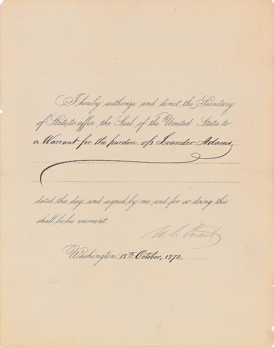 DS as president, one page, 8.5 x 10.75, October 18, 1872. In part: “I hereby authorize and direct the Secretary of State to affix the Seal of the United States to a Warrant for the pardon of Leander Adams.” Signed at the conclusion by President Grant. In fine condition, with a bit of light chipping to the edges.