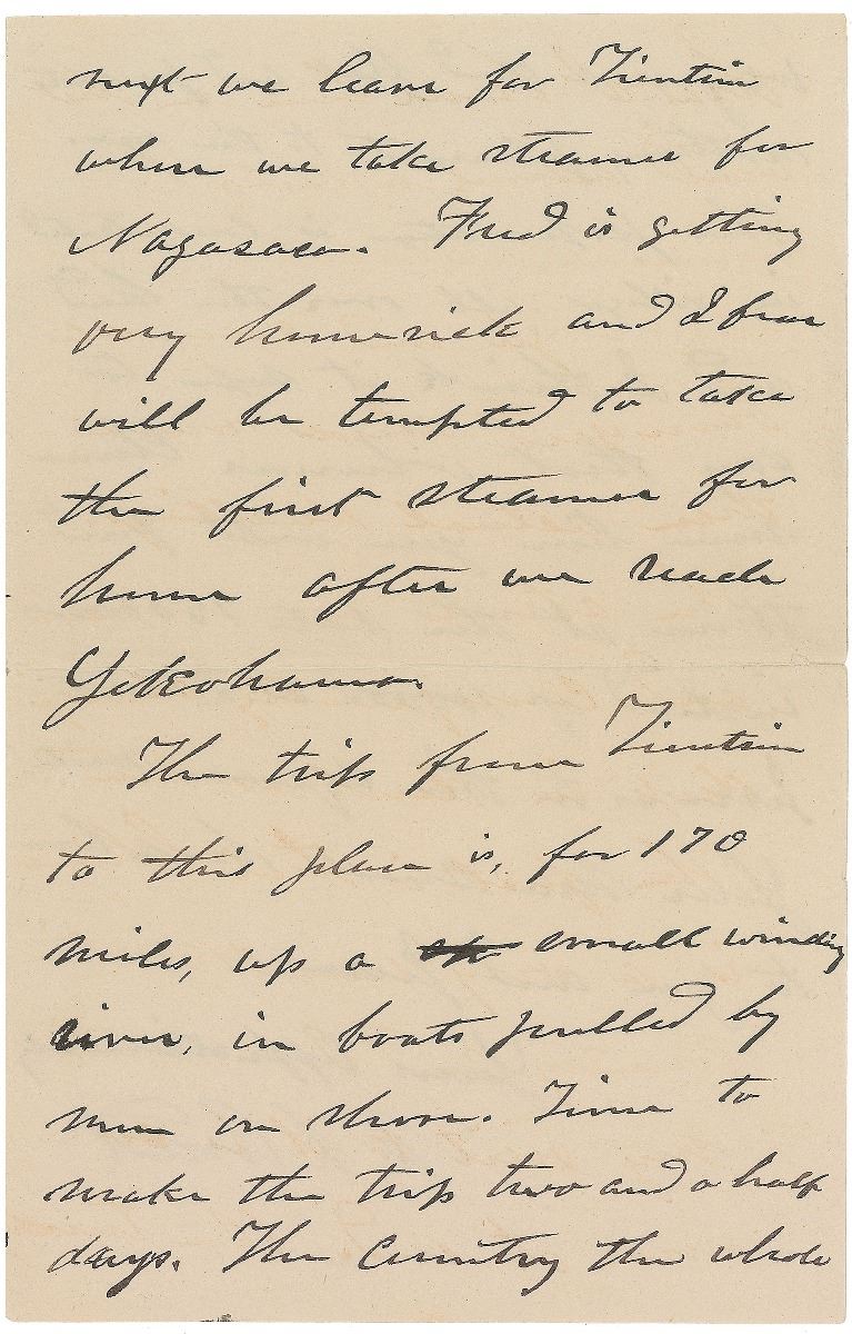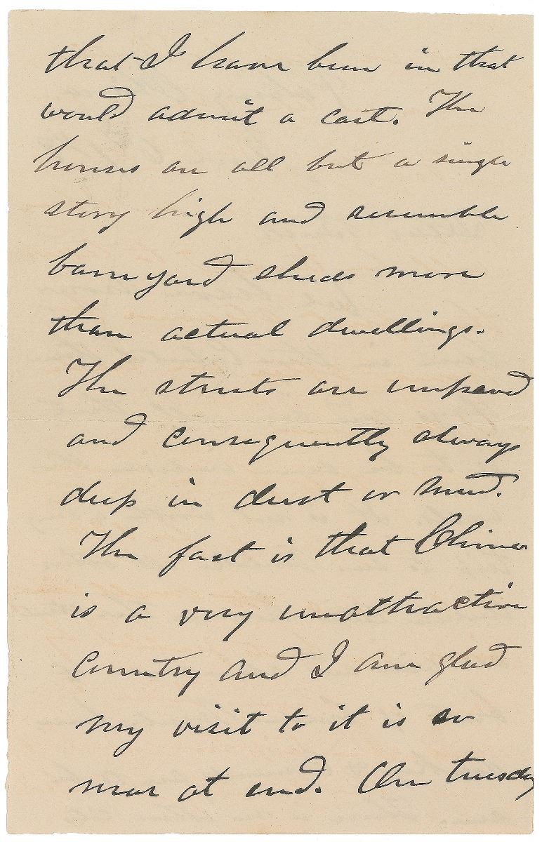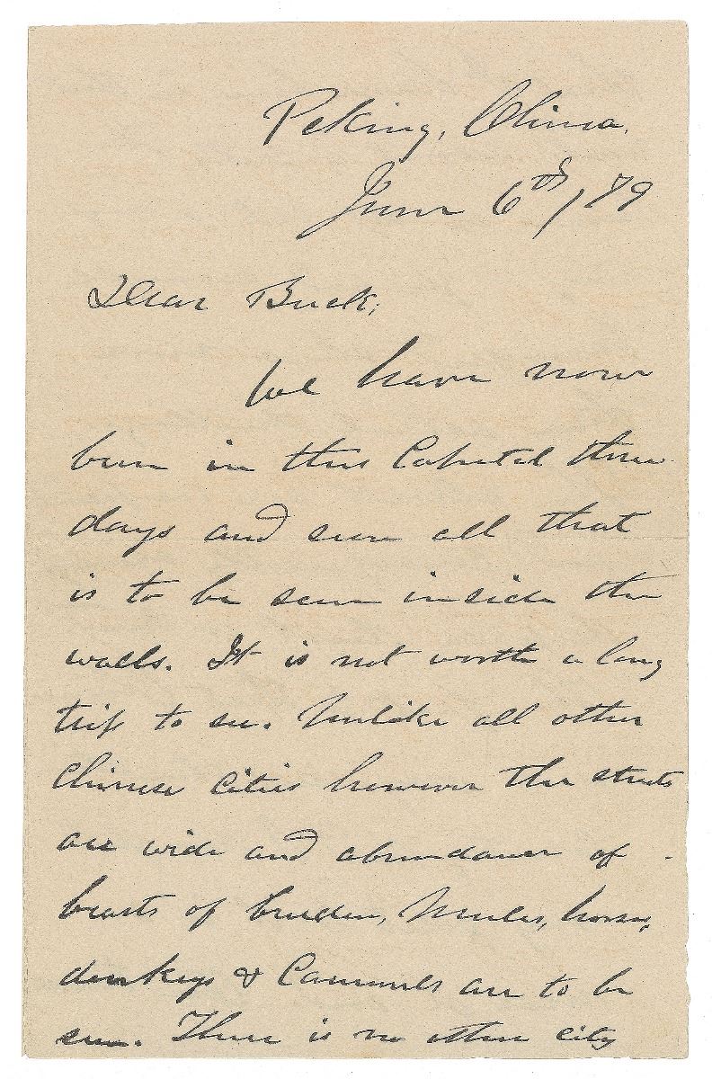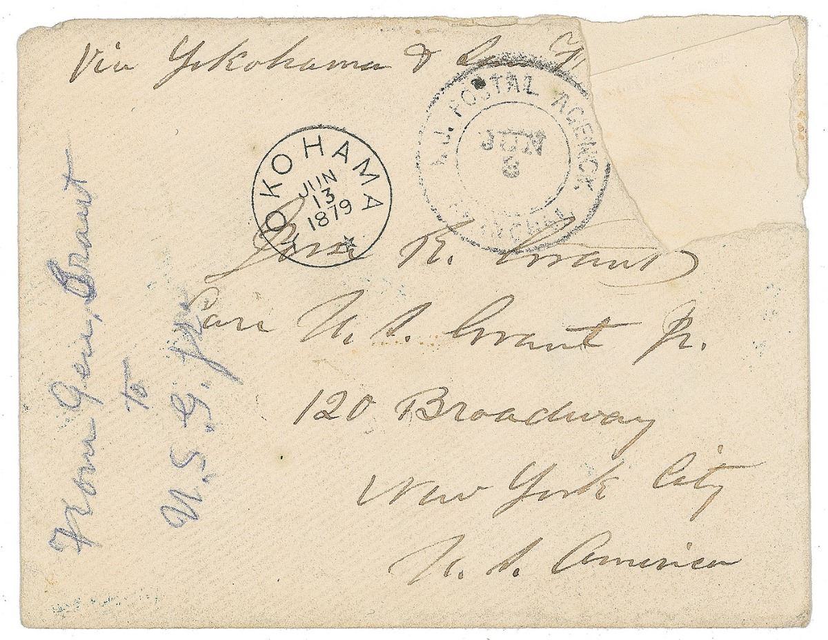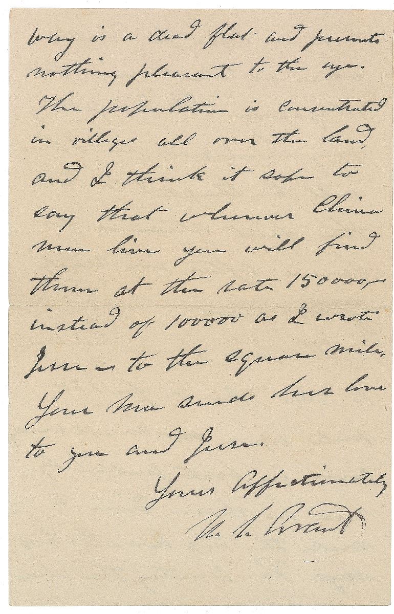 ALS, four pages, 4.5 x 7, June 6, 1879. Letter to his son U. S. Grant, Jr., written from “Peking, China.” In full: “We have now been in this Capital three days and seen all that is to be seen inside the walls. It is not worth a long trip to see. Unlike all other Chinese cities however the streets are wide and abundance of beasts of burden, mules, horses, donkeys & camels are to be seen. There is no other city that I have been in that would admit a cart. The houses are all but a single story high and resemble barnyard sheds more than actual dwellings. The streets are unpaved and consequently always deep in dust or mud. The fact is that China is a very unattractive country and I am glad my visit to it is so near at end. On Tuesday next we leave for Tientsin where we take steamer for Nagasaki. Fred is getting very homesick and I fear will be tempted to take the first steamer for home after we reach Yokohama. The trip from Tientsin to this place is, for 170 miles, up a small winding river, in boats pulled by men on shore. Time to make the trip two and a half days. The country the whole way is a dead flat and presents nothing pleasant to the eye. The population is concentrated in villages all over the land and I think it safe to say that wherever China men live you will find them at the rate of 150,000—instead of 100,000 as I wrote Jesse—to the square mile. Your Ma sends her love to you and Jesse.” In fine condition. Accompanied by the original mailing envelope, addressed in his own hand.