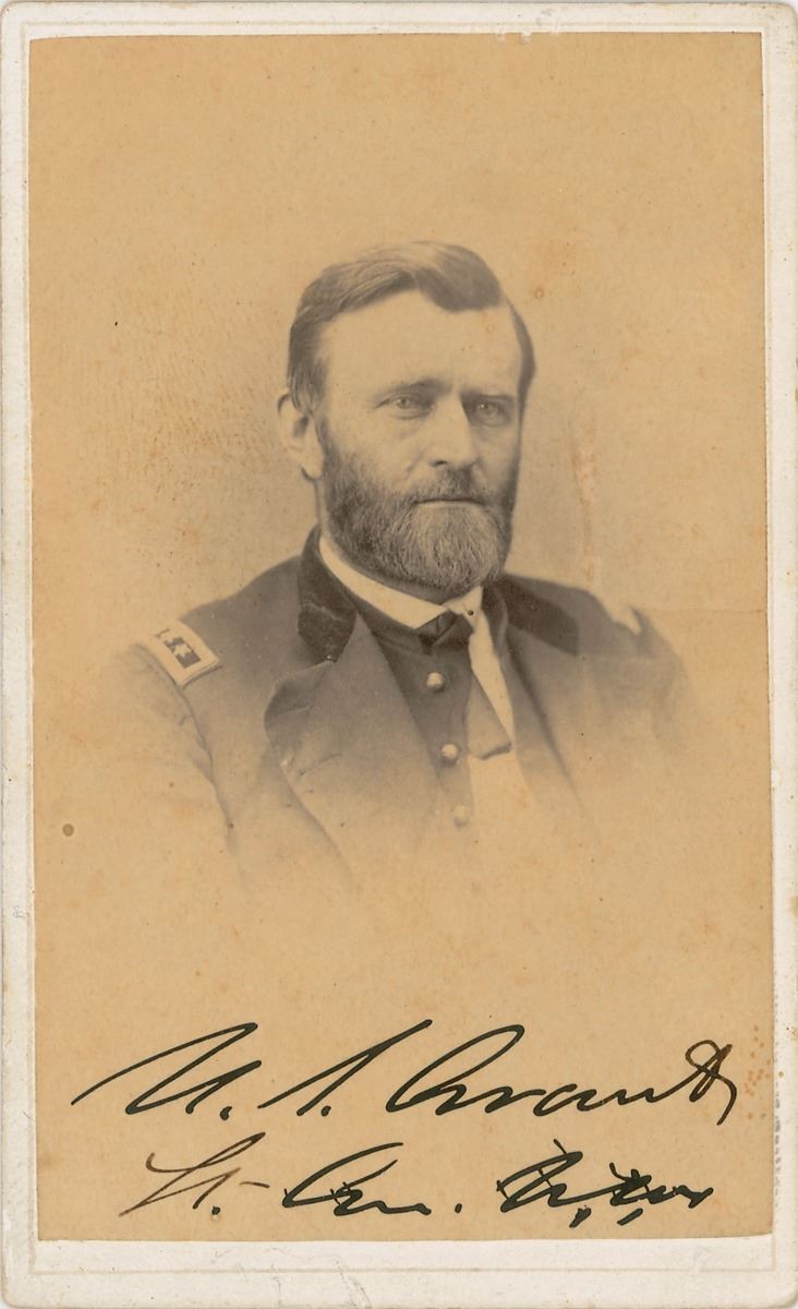 Desirable 2.5 x 4 carte-de-visite portrait of Grant in his military uniform, signed in ink, “U. S. Grant, Lt. Gen. U. S. A.” In fine condition, with a small, light scuff above Grant’s left shoulder. Grant was promoted to lieutenant general by President Lincoln in March 1864 before being elevated to general in August 1866, dating this signature to that period. An ideal example of a Grant carte-de-visite from the Civil War period.