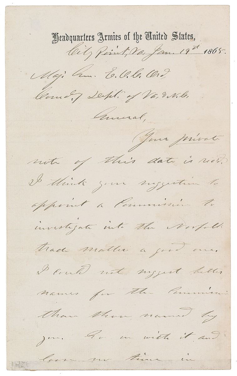 Civil War-dated ALS signed “U. S. Grant, Lt. Gen.,” two pages, 5 x 8, Headquarters Armies of the United States letterhead, January 19, 1865. Letter to Major General Edward O. C. Ord, in full: “Your private note of this date is rec’d. I think your suggestion to appoint a Commission to investigate into the Norfolk trade matter a good one. I could not suggest better names for the Commission than those named by you. Go on with it and lose no time in having the Commission commence its work.” In fine condition, with light show-through from old tape along one edge of each page.