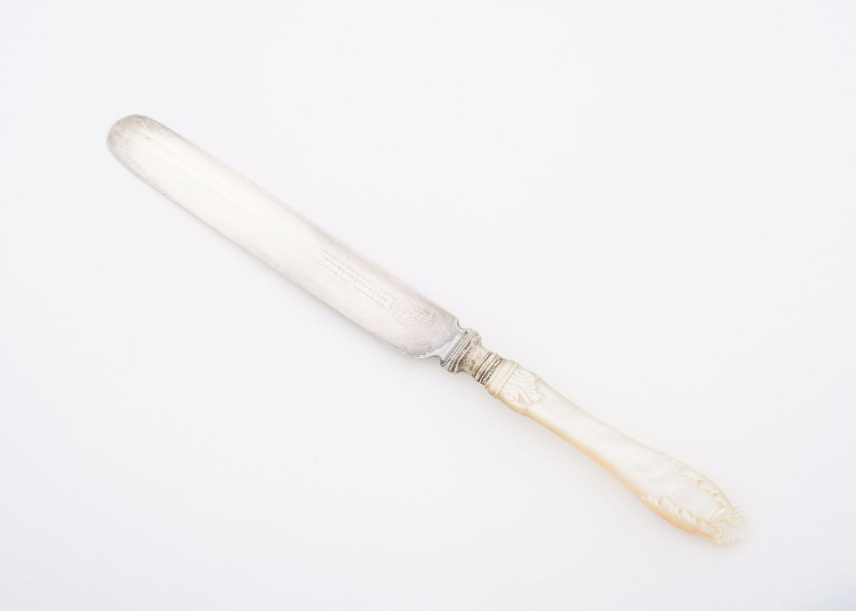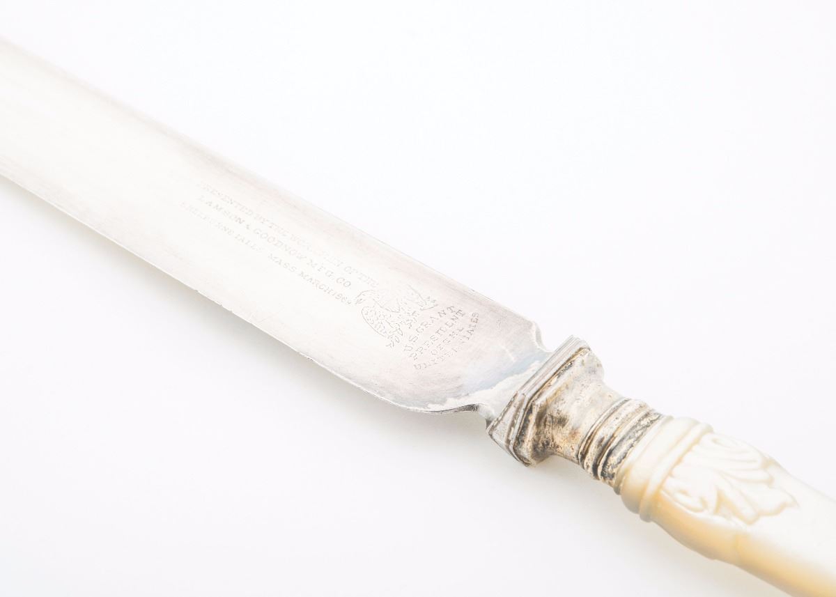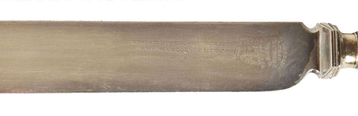 President Grant’s gorgeous personally-owned table knife, measuring 10.75? long, featuring a beautiful pearl handle carved with maple leaf designs and stamped on the blade, “Presented by the workmen of the Lamson & Goodnow Mfg. Co., Shelburne Falls, Mass, March 1869,” with another stamp of a patriotic eagle lettered below, “U. S. Grant, President of the United States.” Representing the Lamson & Goodnow workers, B. F. Pond presented a 62-piece dinner set to President Grant on November 17, 1869; half of the pieces were set in pearl handles and the other half in ivory, all engraved with the same maple leaf designs on the handles. President Grant sent a message to the workers in response, writing, ‘It affords me special pleasure to see American Manufacturies succeed in making those things which are generally articles of import. The specimens of cutlery sent me affords such evidence in one line of Manufactury at least.’ It is indeed a wonderful knife in itself, and such visually appealing personal articles that are specifically mentioned within presidential papers represent the highest echelon of collectibility. A truly stunning piece with the potential for an attractive display. From the Raleigh DeGeer Amyx Collection.