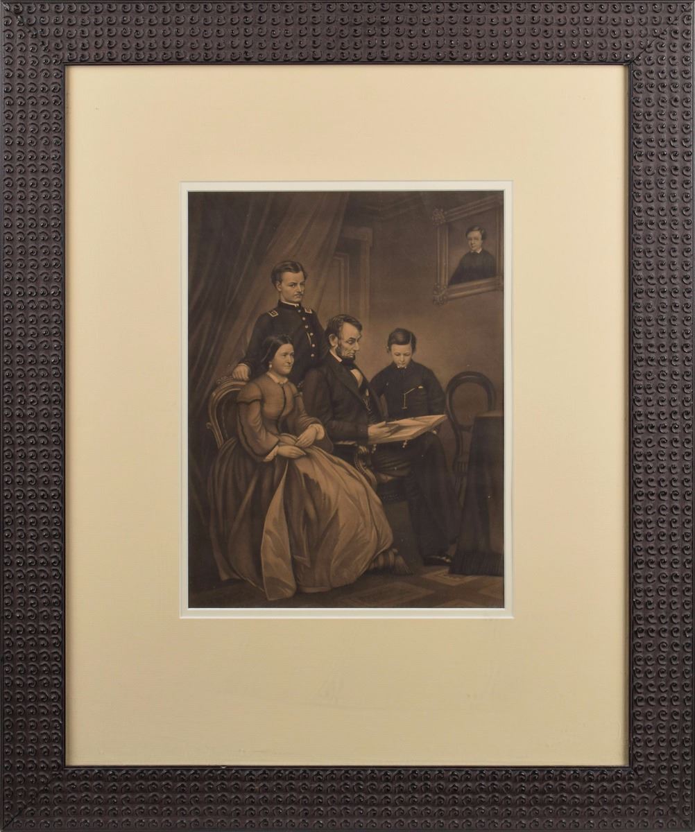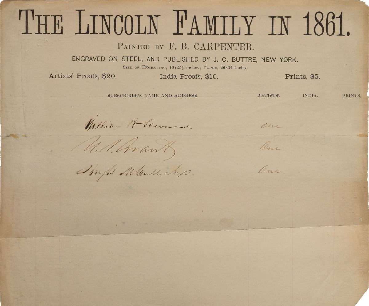 Unusual DS, one page, 9.25 x 7.25, no date. Subscription form for the purchase of an artist's proof of the engraving entitled 'The Lincoln Family in 1861,' signed by his secretary of state, "William H. Seward," top general, "U. S. Grant," and treasury secretary, "Hugh McCulloch." In fine condition, with a diagonal crease across the bottom. Accompanied by a modern copy of a different print framed to an overall size of 21 x 25. The print 'Lincoln Family in 1861,' painted by F. B. Carpenter and engraved by J. C. Buttre, was released during Grant's presidency in 1873. A fantastic Lincoln association piece. Pre-certified PSA/DNA.