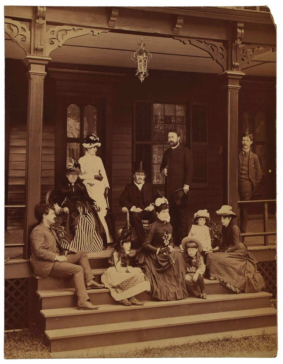 Mounted albumen photograph of the Grant family, 9 x 10.75, taken on July 23, 1885, showing President Grant with his wife Julia, sons Frederick, Ulysses, and Jesse, and daughter Nellie. Seated on the steps are Frederick Dent Grant's wife, Ida Marie Honore, and their children Julia and Ulysses. Seated to the left is Ulysses S. Grant, Jr.'s wife Fannie, and their eldest daughter Miriam. In fine condition, with minor loss to the upper right corner.