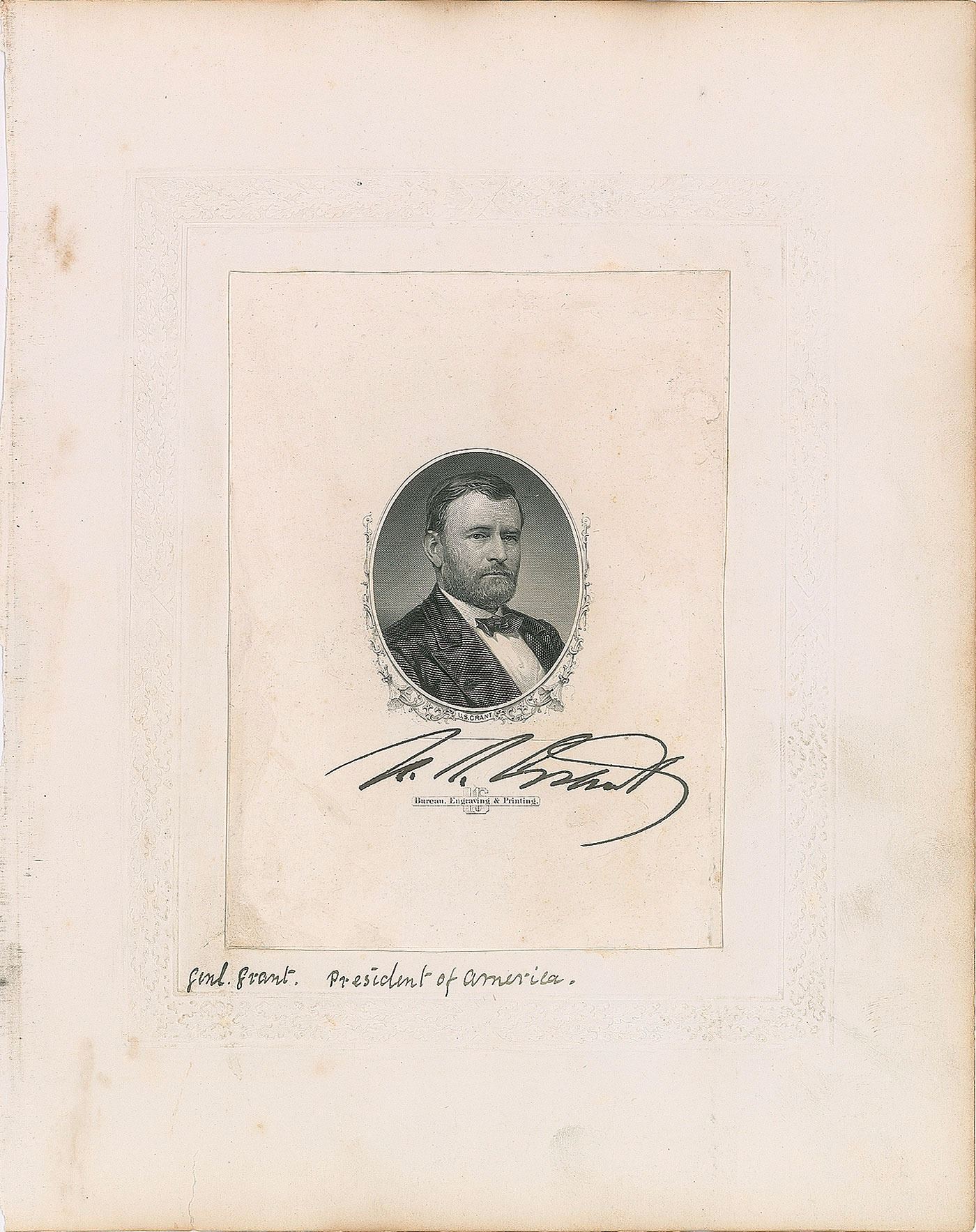 Exceptional engraved portrait of President Grant by the US Bureau of Engraving and Printing, 4 x 5.5, signed in black by Grant. Affixed to an 8 x 10 sheet bearing collector's notations. In fine condition, with trimmed edges and light soiling.