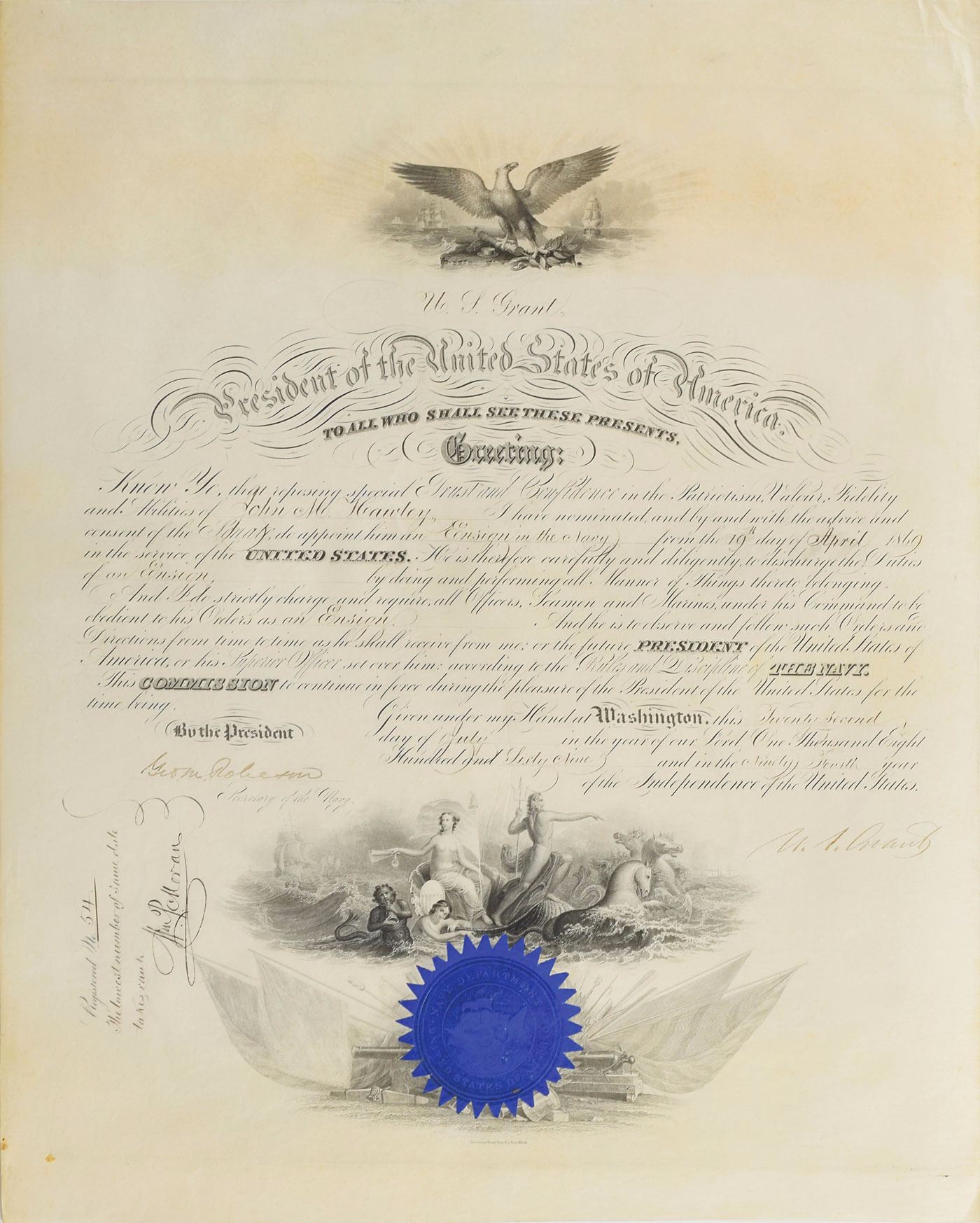 Partly-printed vellum DS as president, one page, 16 x 20, July 22, 1869. President Grant appoints John W. Hawley as an "Ensign in the Navy." Signed at the conclusion by Grant, and countersigned by Secretary of the Navy George M. Robeson. Blue Navy Department seal remains affixed to lower vignette. In fine condition, with light creasing to the upper right corner.