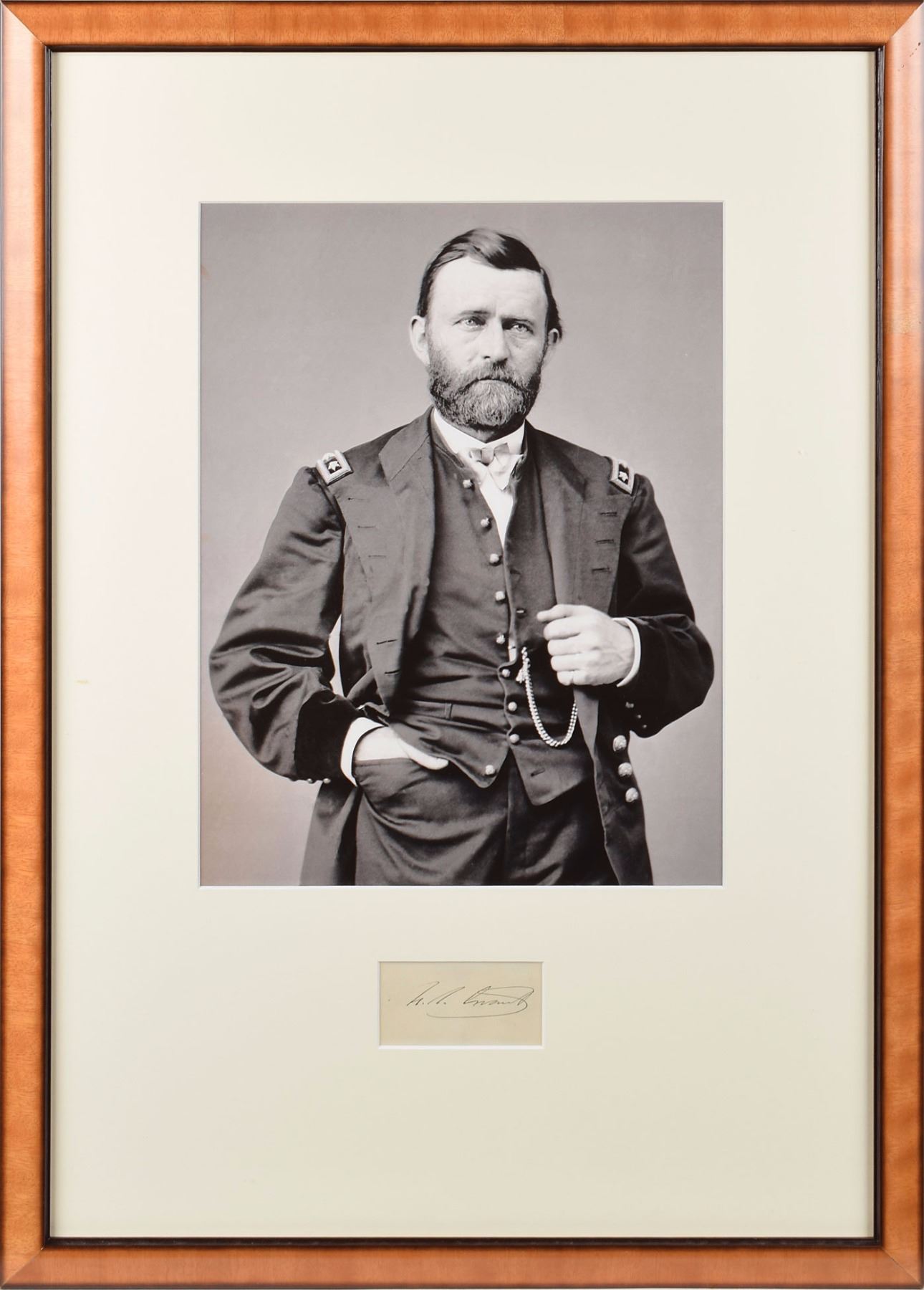 Attractive ink signature, "U. S. Grant,” on an off-white 3.25 x 1.5 sheet. Nicely matted and framed with a portrait of Grant to an overall size of 18.25 x 25.25. In fine condition.
