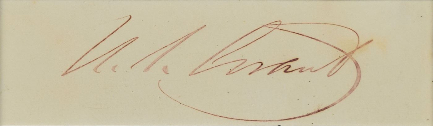 Large ink signature as president, "U. S. Grant,” on an off-white 4.25 x 1.25 slip. Framed with a mat to cover the balance of the document, which bears a window to reveal the date, "May 9/74," and a small engraved image of Grant to an overall size of 7.5 x 11.5. In fine condition.