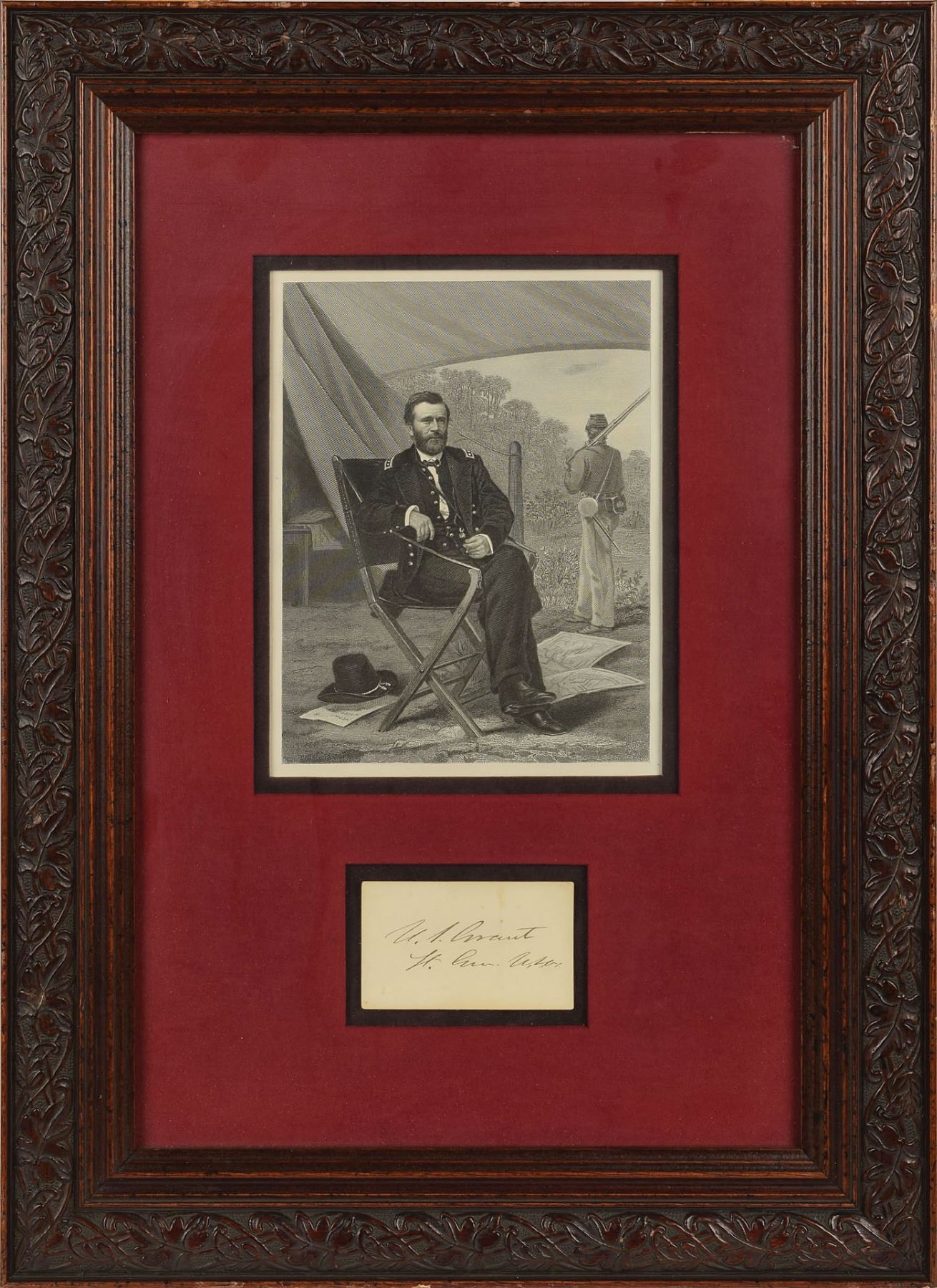 Ink signature, "U. S. Grant, Lt. Gen. U.S.A.,” on a white 3.25 x 2 card. Cloth-matted and framed with an engraving of Grant to an overall size of 14 x 19.25. In fine condition, with a bit of light staining.