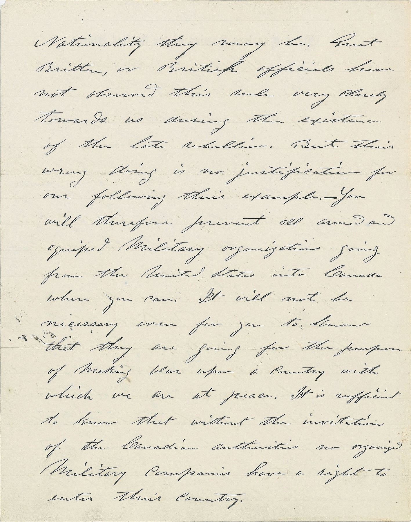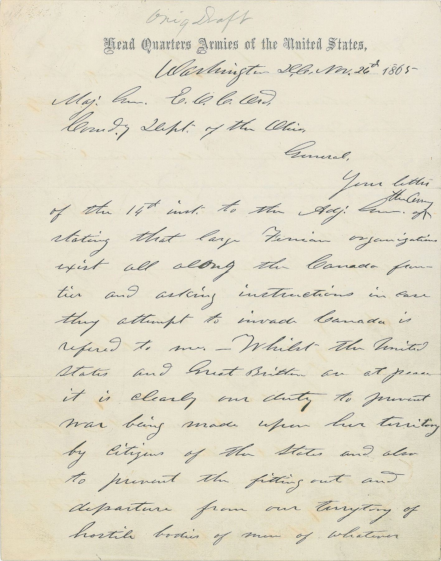 Handwritten letter from Commanding General U. S. Grant, unsigned, three pages on two adjoining sheets, 7.75 x 9.75, Head Quarters Armies of the United States letterhead, November 26, 1865. Letter to Major General E. O. C. Ord, Commander of the Department of the Ohio, in full (spelling and grammar retained): "Your letter of the 14th inst. to the Adj. Gen. of the Army stating that large Fenian organizations exist all along the Canada frontier and asking instructions in case they attempt to invade Canada is refered to me. Whilst the United States and Great Britten are at peace it is clearly our duty to prevent war being made upon her territory by Citizens of the States and also to prevent the fitting out and departure from our terrytory of hostile bodies of men of whatever Nationality they may be. Great Britten, or British officials have not observed this rule very closely towards us during the existence of the late rebellion. But this wrong doing is no justification for our following their example. You will therefore prevent all armed and equiped military organizations going from the United States into Canada where you can. It will not be necessary even for you to know that they are going for the purpose of making war upon a country with which we are at peace. It is sufficient to know that without the invitation of the Canadian authorities no organized Military Companies have a right to enter their country.