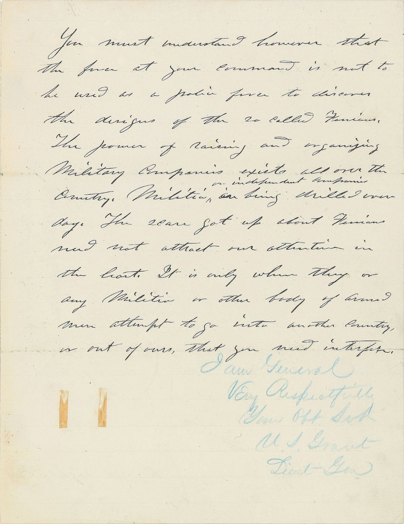 You must understand however that the force at your command is not to be used as a police force to discover the designs of the so called Fenians. The power of raising and organizing Military Companies exists all over the country. Militia or independent companies are being drilled every day. The scare got up about the Fenians need not attract our attention in the least. It is only when they or any Militia or other body of armed men attempt to go into another country, or out of ours, that you need interfere.” Concluding blue pencil subscription and signature of Grant written by in a secretarial hand. In fine condition, with splitting to the hinge and folds, and two small tape stains to the lower blank area of the second page.