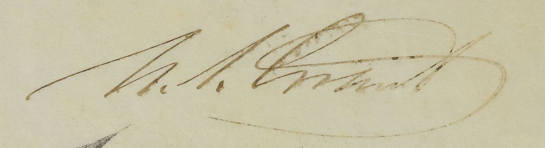 Handsomely engraved partly printed vellum DS, one page, 15.5 x 19.75, December 20, 1876. President Grant appoints Alexander L. Morton as "First Lieutenant in the Fifth Regiment of Artillery in the service of the United States." Signed at the conclusion by Grant, and countersigned by Secretary of War J. Donald Cameron, with Adjutant General Edward D. Townsend signing in the upper left corner. Commission retains its original dark blue seal. Rolled and in fine condition, with minor brushing to the signature.