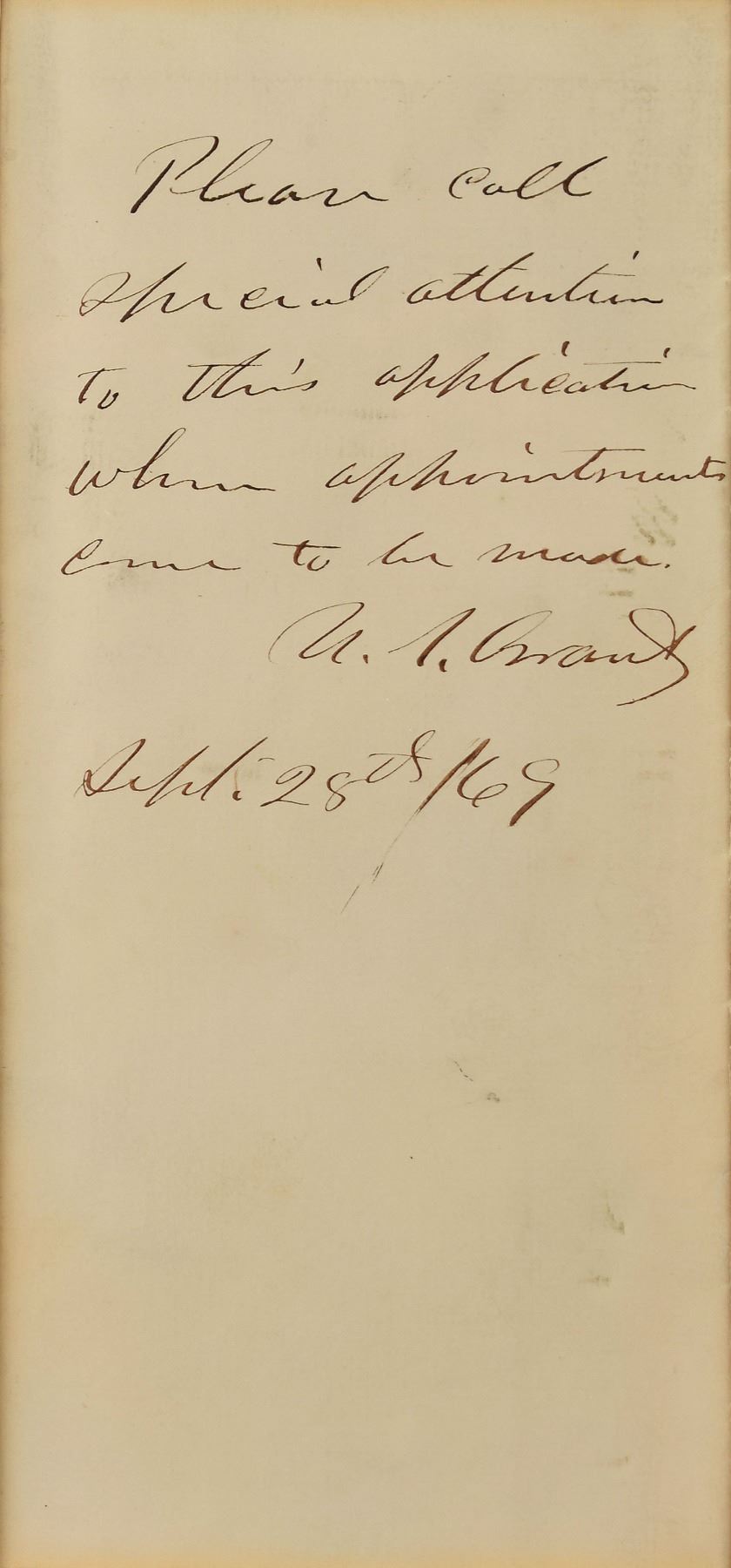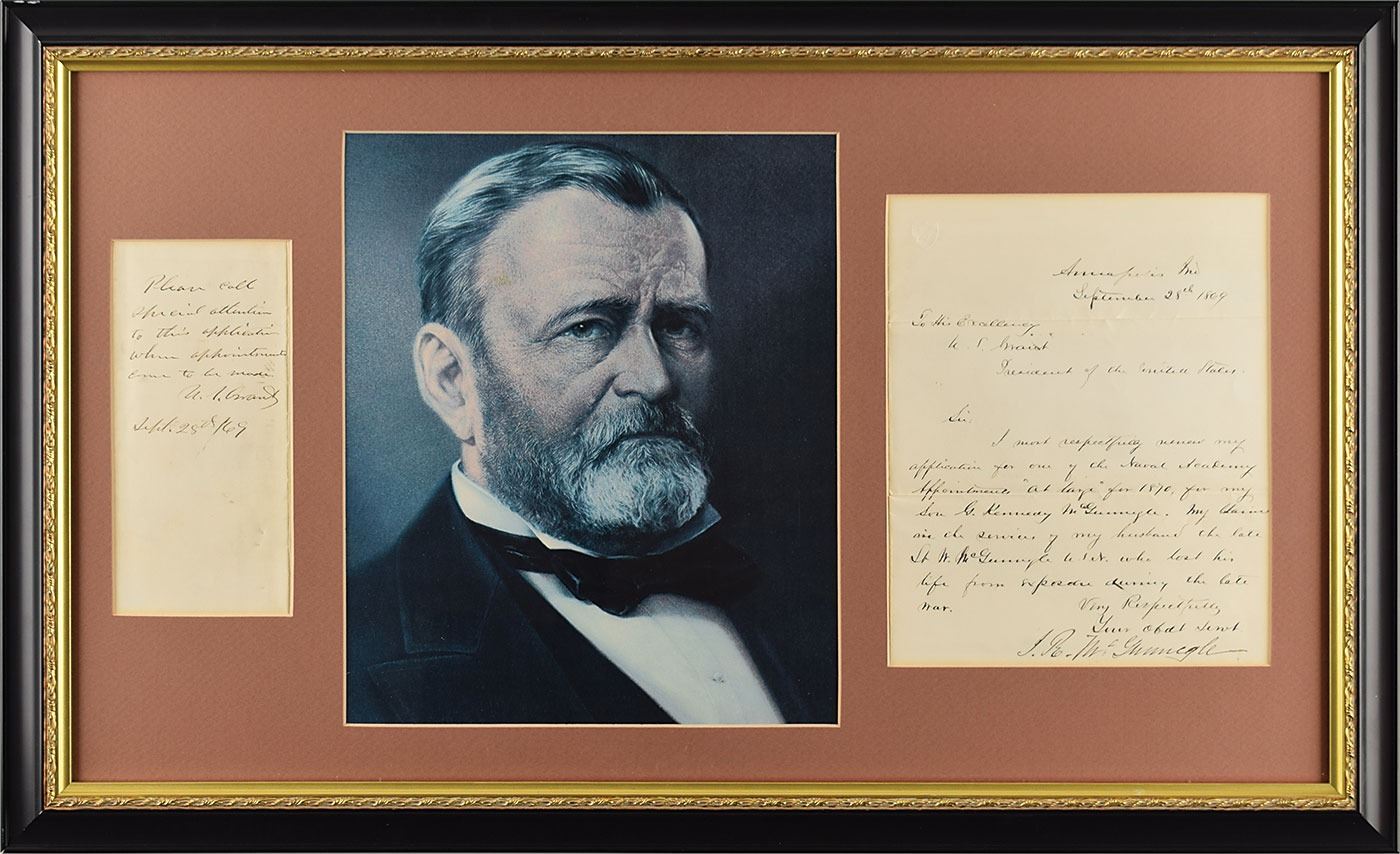Autograph endorsement as president, one page, 3.5 x 7.75, clipped from the second integral page of a request letter sent to Grant on September 28, 1869. The president's endorsement, in full: "Please call special attention to this application when appointments come to be made. U. S. Grant." Matted and framed with a large portrait of Grant and the original request letter from J. R. McGunnigle, written to the president on behalf of her son, to an overall size of 28.5 x 17.5; the letter, sent from Annapolis, Maryland, reads, in full: "I most respectfully renew my application for one of the Naval Academy Appointments 'at large' for 1870, for my son G. Kennedy McGunnigle. My claims in the services of my husband the late Lt. W. McGunnigle U.S.N. who lost his life from exposure during the late war." In fine condition.