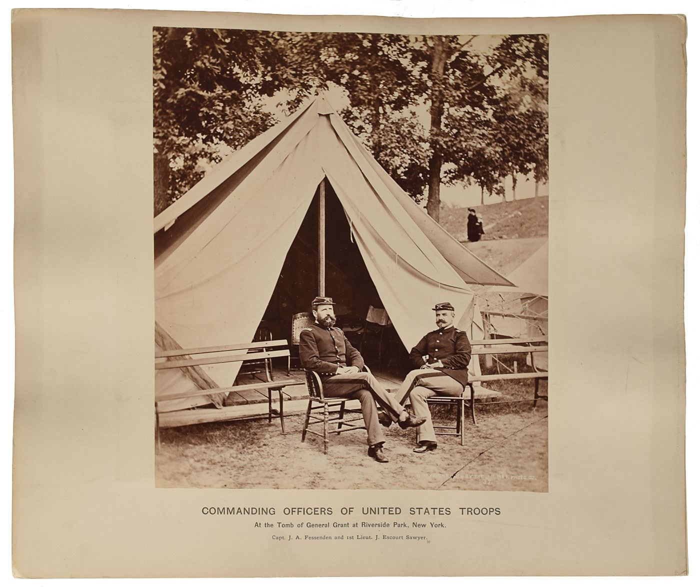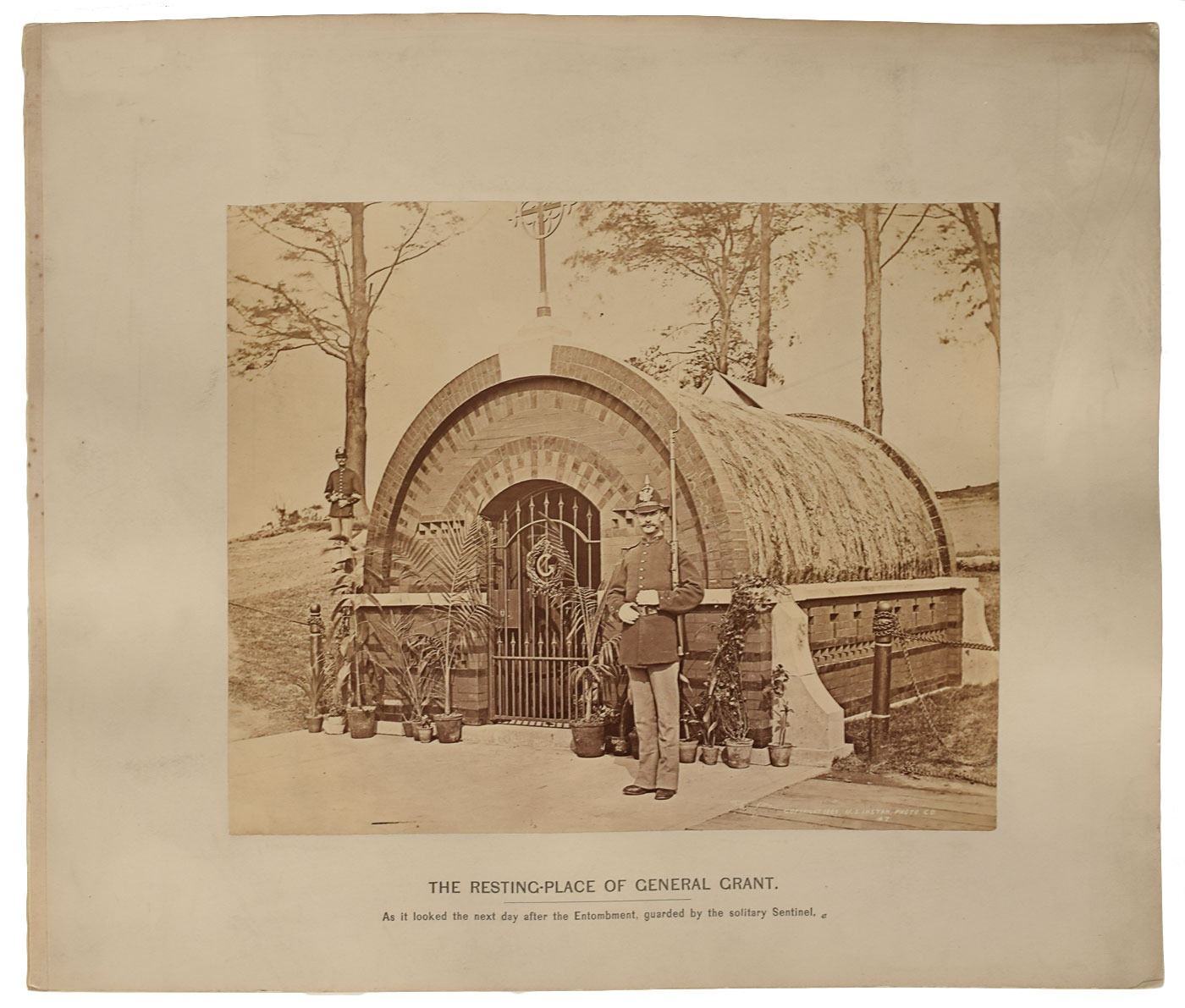 Impressive pairing of vintage matte-finish photographs commemorating the resting place of U. S. Grant, affixed to the front and reverse of an off-white 17 x 14.25 photographic album page bearing informational captions below the respective photos. The front image, 11.5 x 9.25, depicts Grant's tomb the day after his interment, with a soldier guarding the front gate, and another to the rear. The photo on the reverse measures 10 x 11.75 and portrays Captain J. A. Fessenden and First Lieutenant J. Escourt Sawyer sitting with crossed legs near the tomb of General Grant in New York’s Riverside Park. Inherent to both photographs is a copyright in the lower right corner, "Copyright 1886 by the U.S. Inst. Photo. Co." In fine condition, with rippling and soiling to the borders.