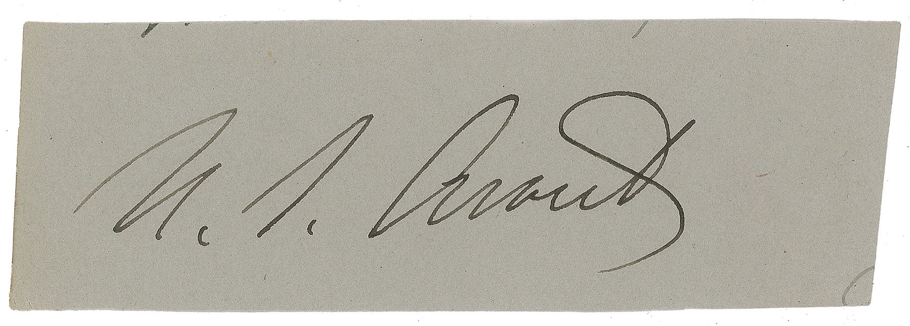 Large and crisp ink signature, "U. S. Grant,” on a light gray 3.75 x 1.25 slip. In fine condition.